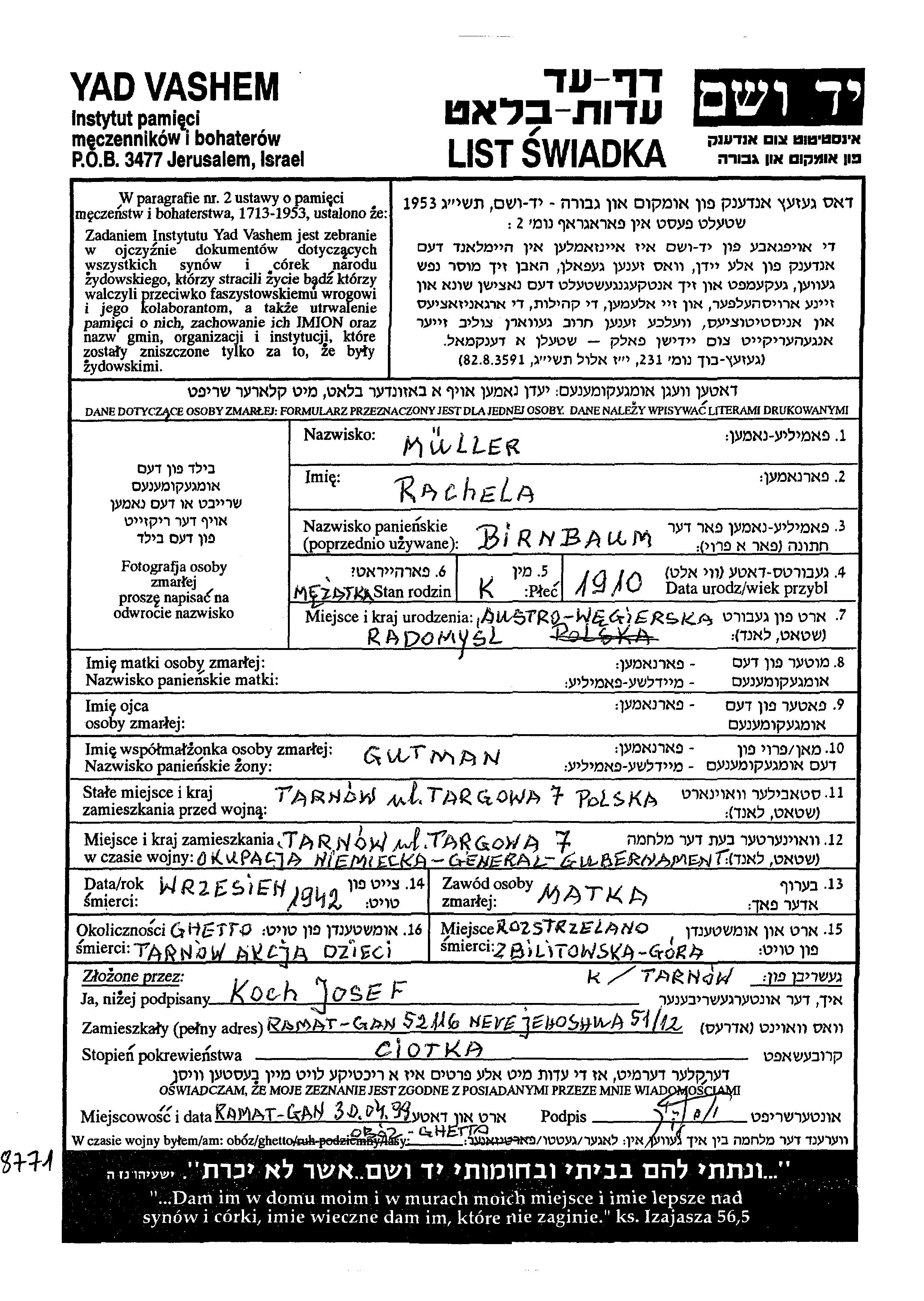 Муллер Рахела 1910 Тарнув, Польша Лист свидетельских показаний
