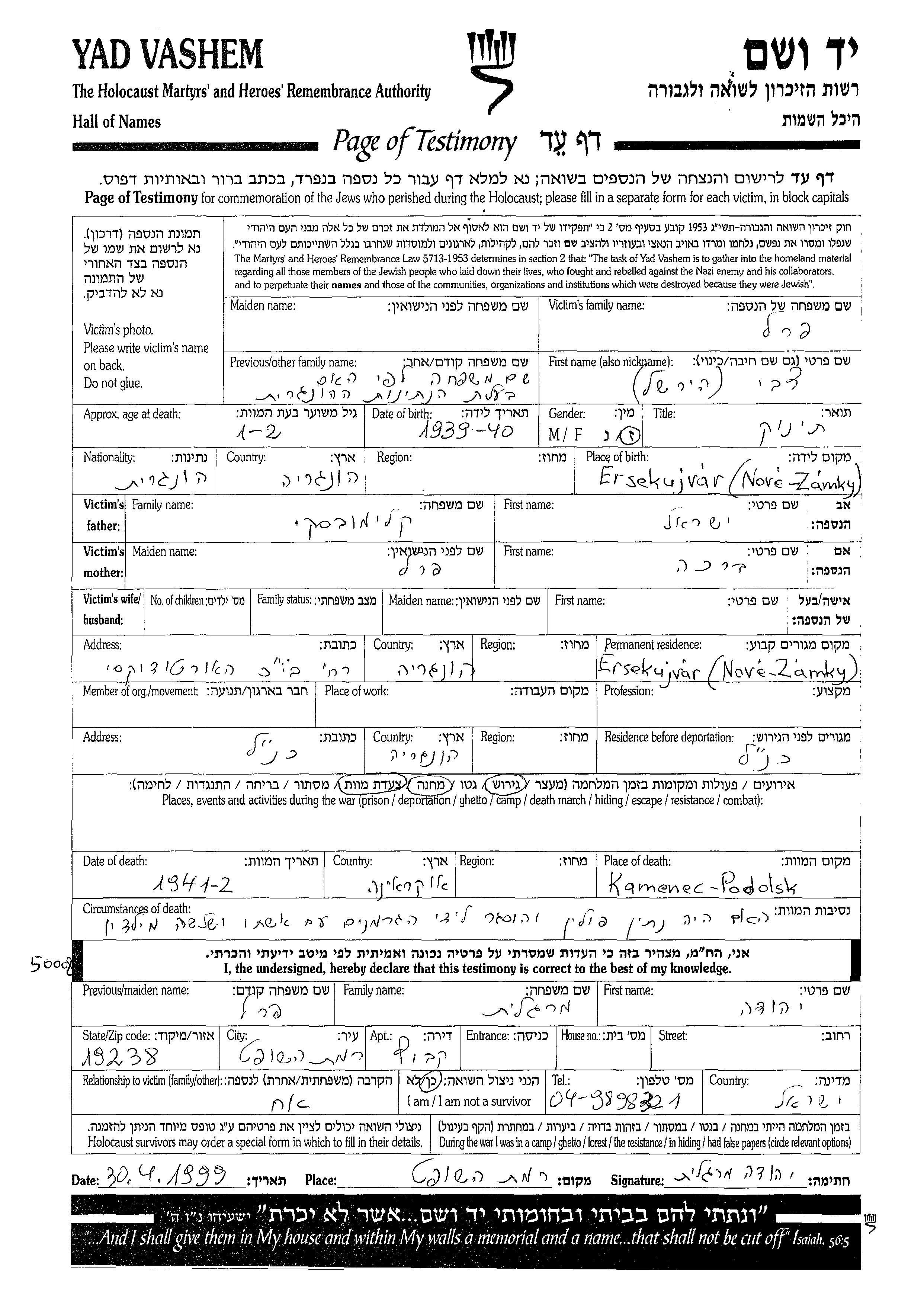 Яд Вашем - Листы свидетельских показаний Мемориального фонда