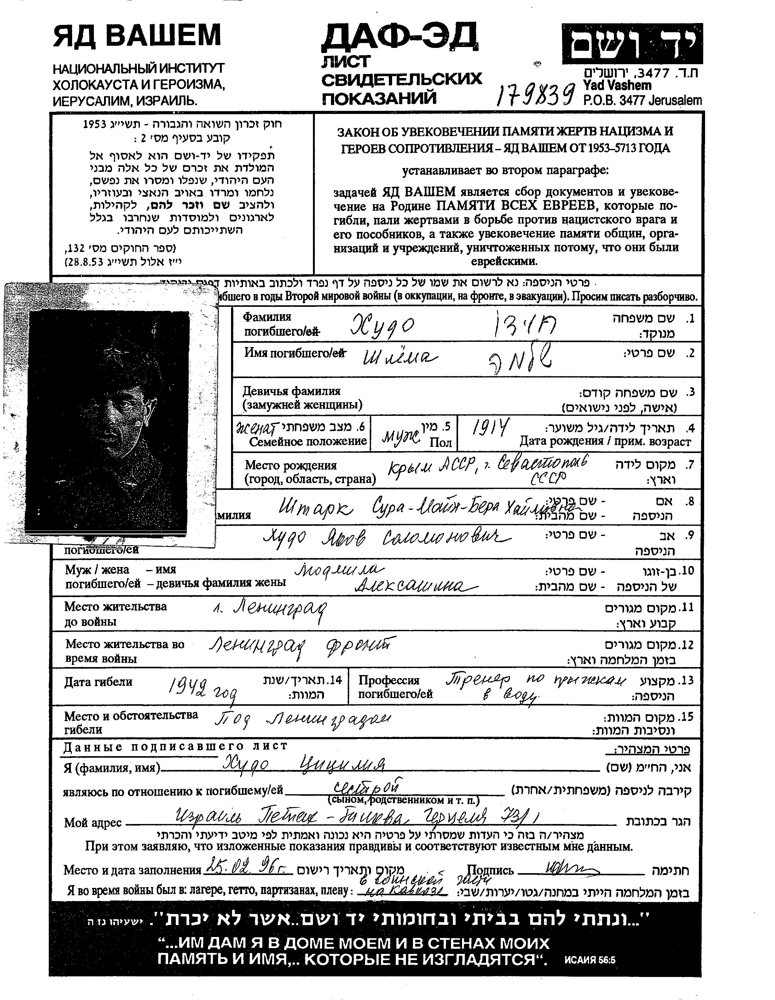 Яд Вашем - Листы свидетельских показаний Мемориального фонда