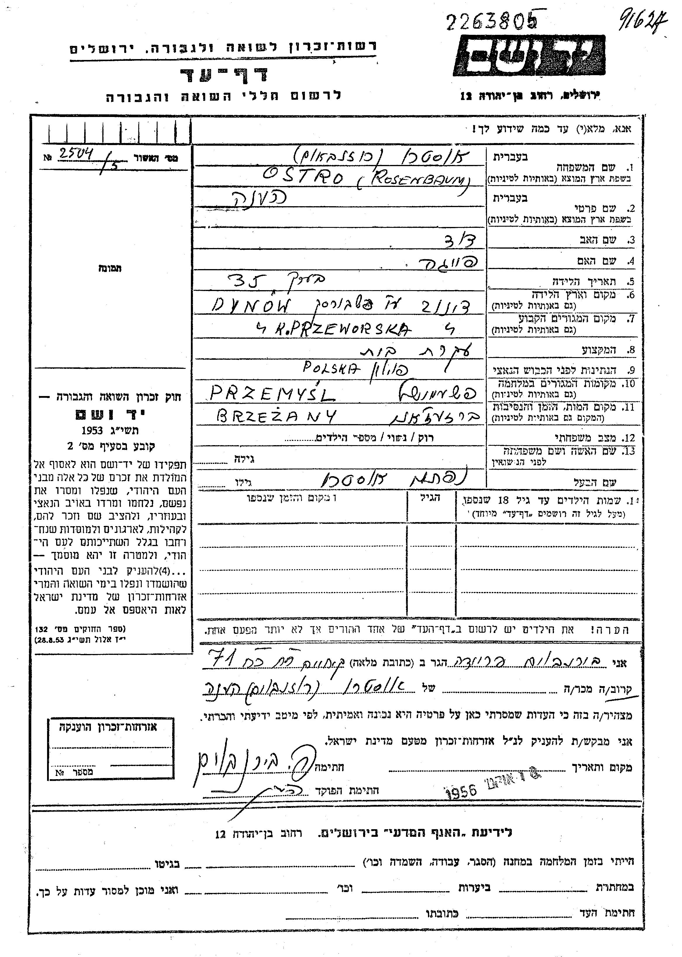 Хене Остро, девичья фамилия Розенбаум, место рождения: Дынув, Польша. Домохозяйка. Место жительства до войны: Дынув, Польша.