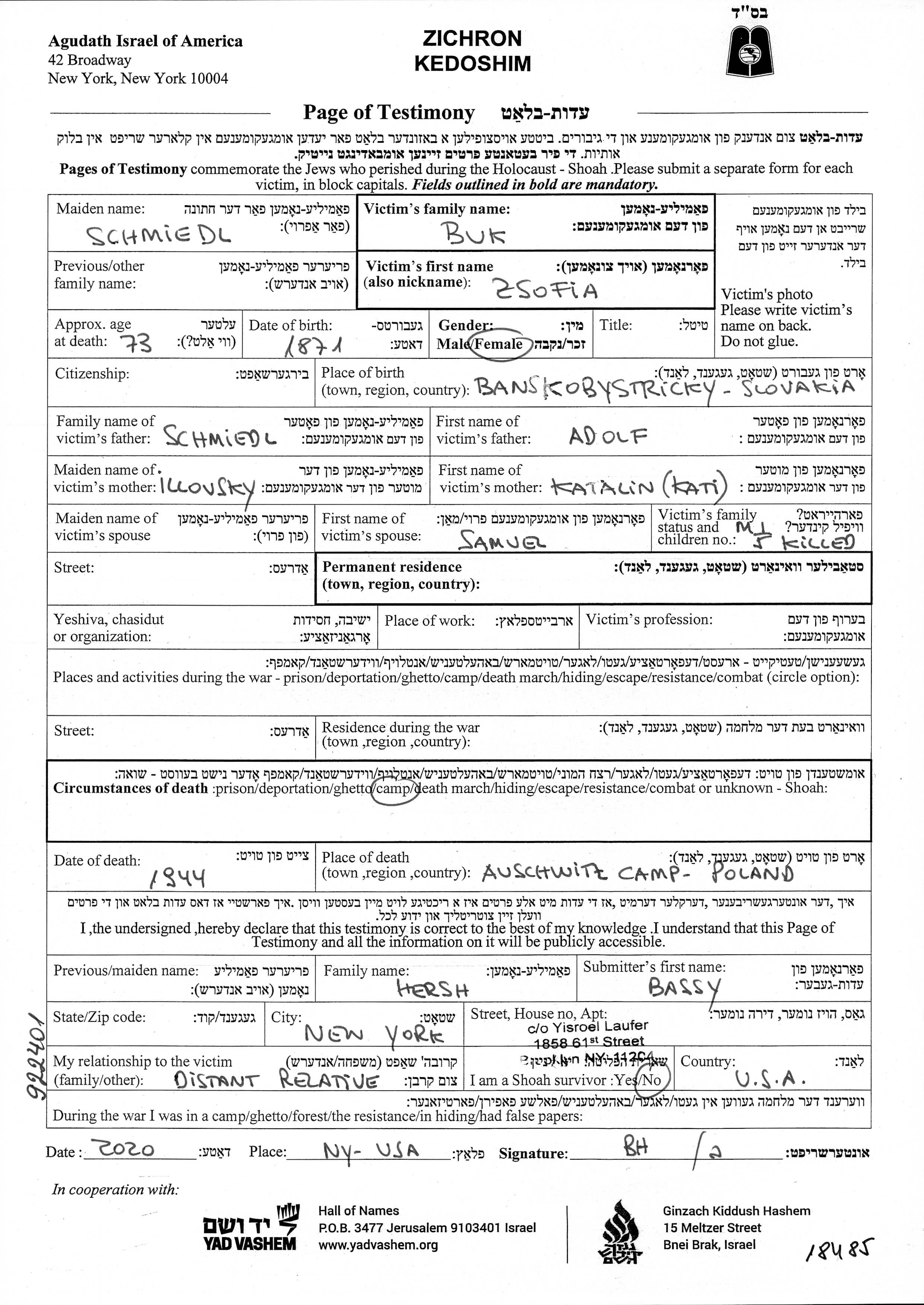 Зофия Бук, девичья фамилия Шмидль, место рождения: Ковар, Чехословакия. Место жительства до войны: Вац, Венгрия.