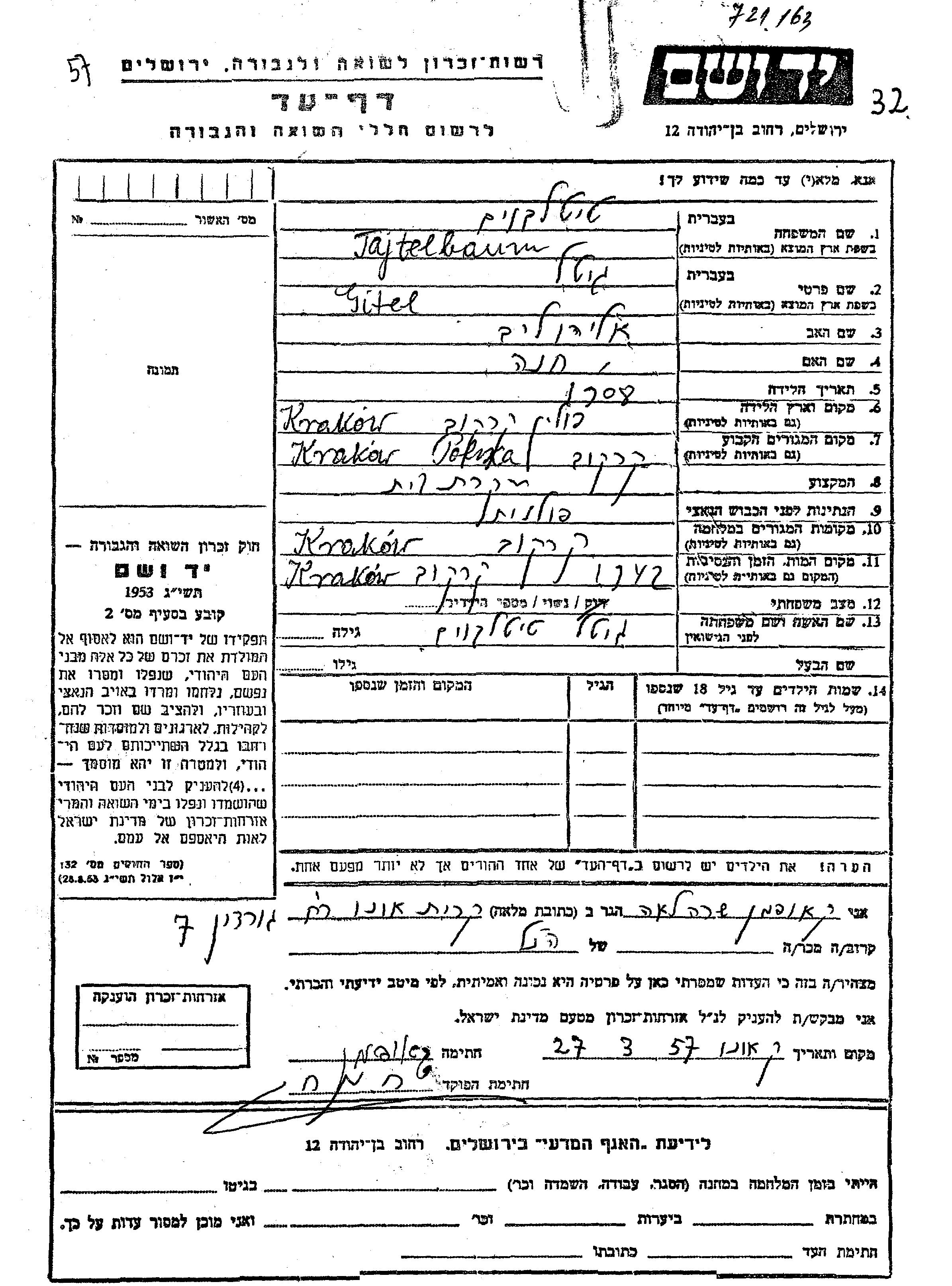 Тайтельбаум Гитель 1908 Краков, Польша Лист свидетельских показаний