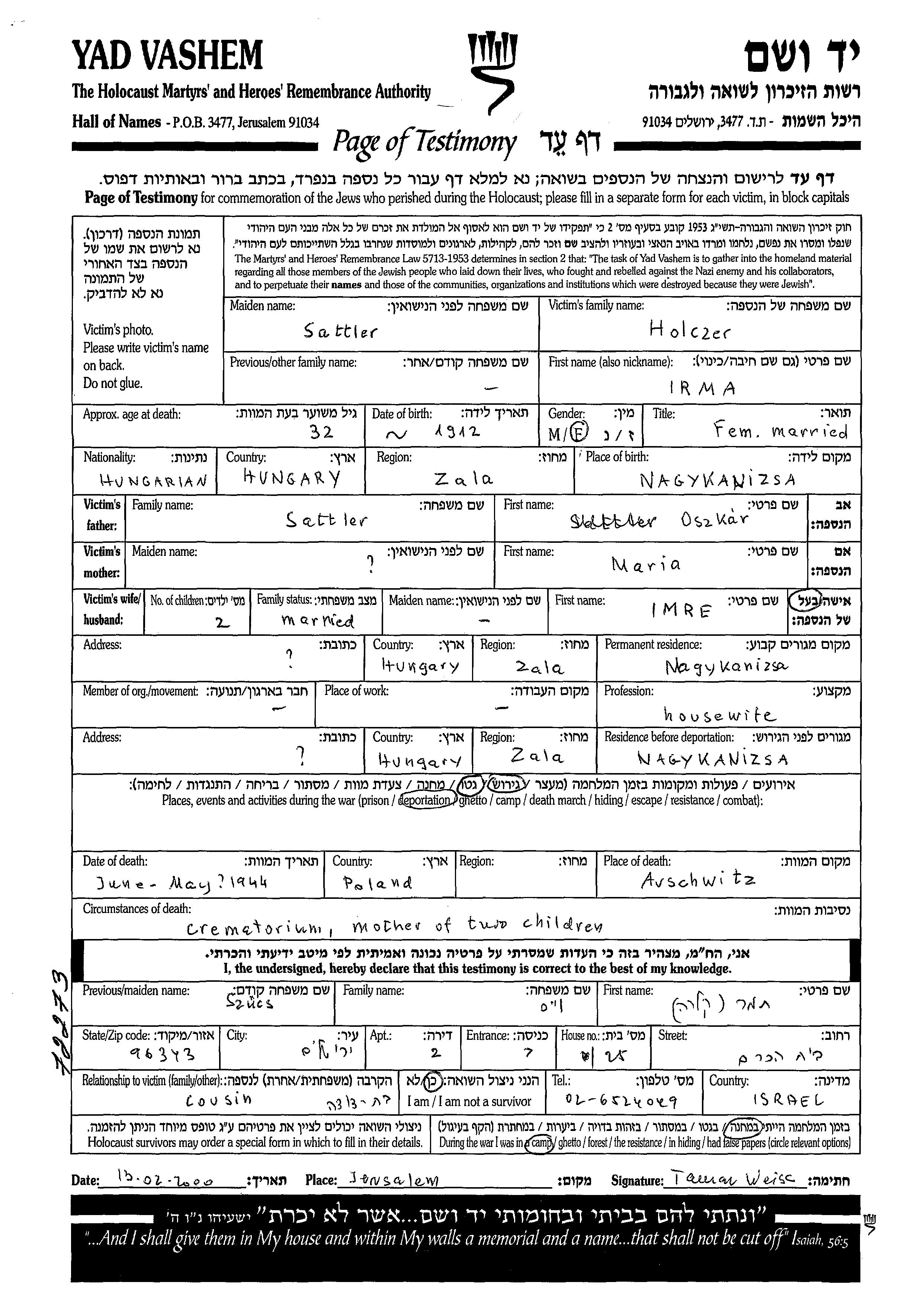 Хольцер Ирма 1912 Надьканижа, Венгрия Лист свидетельских показаний