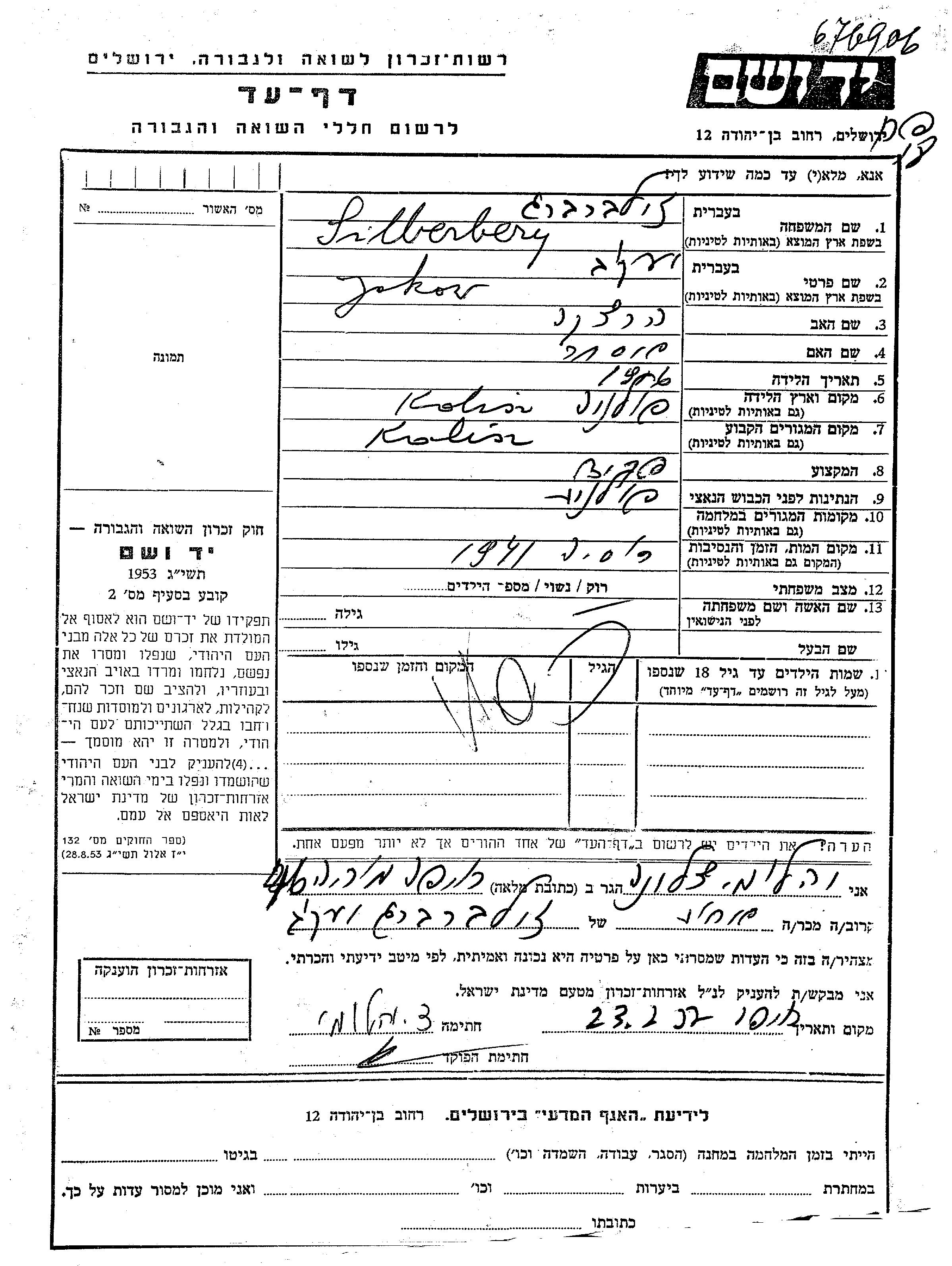 Зильберберг Яков Йосеф 1916 Калиш, Польша Лист свидетельских показаний