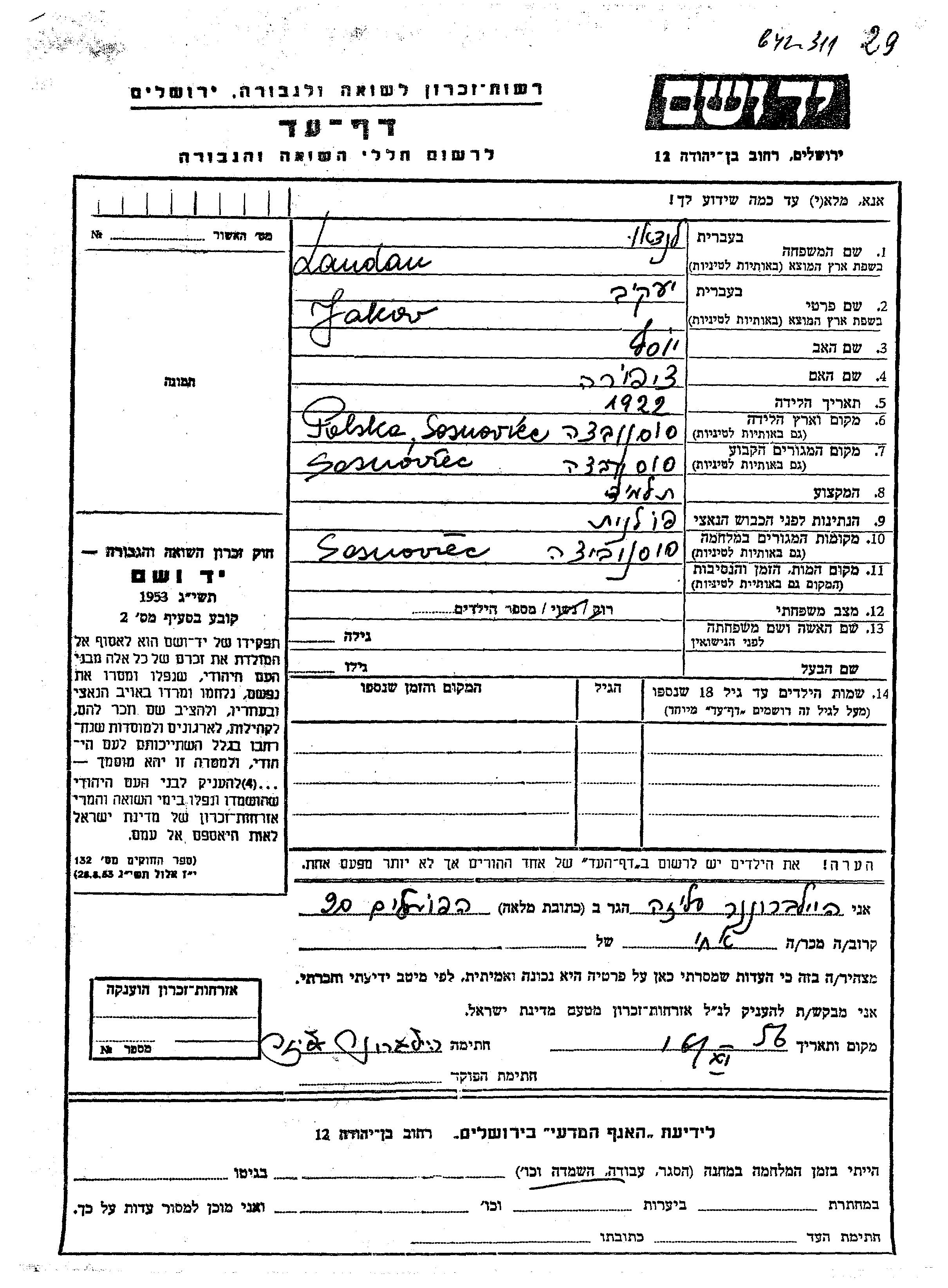 | Ландау | Яков | 1922 | Сосновец, Польша | Лист свидетельских показаний |