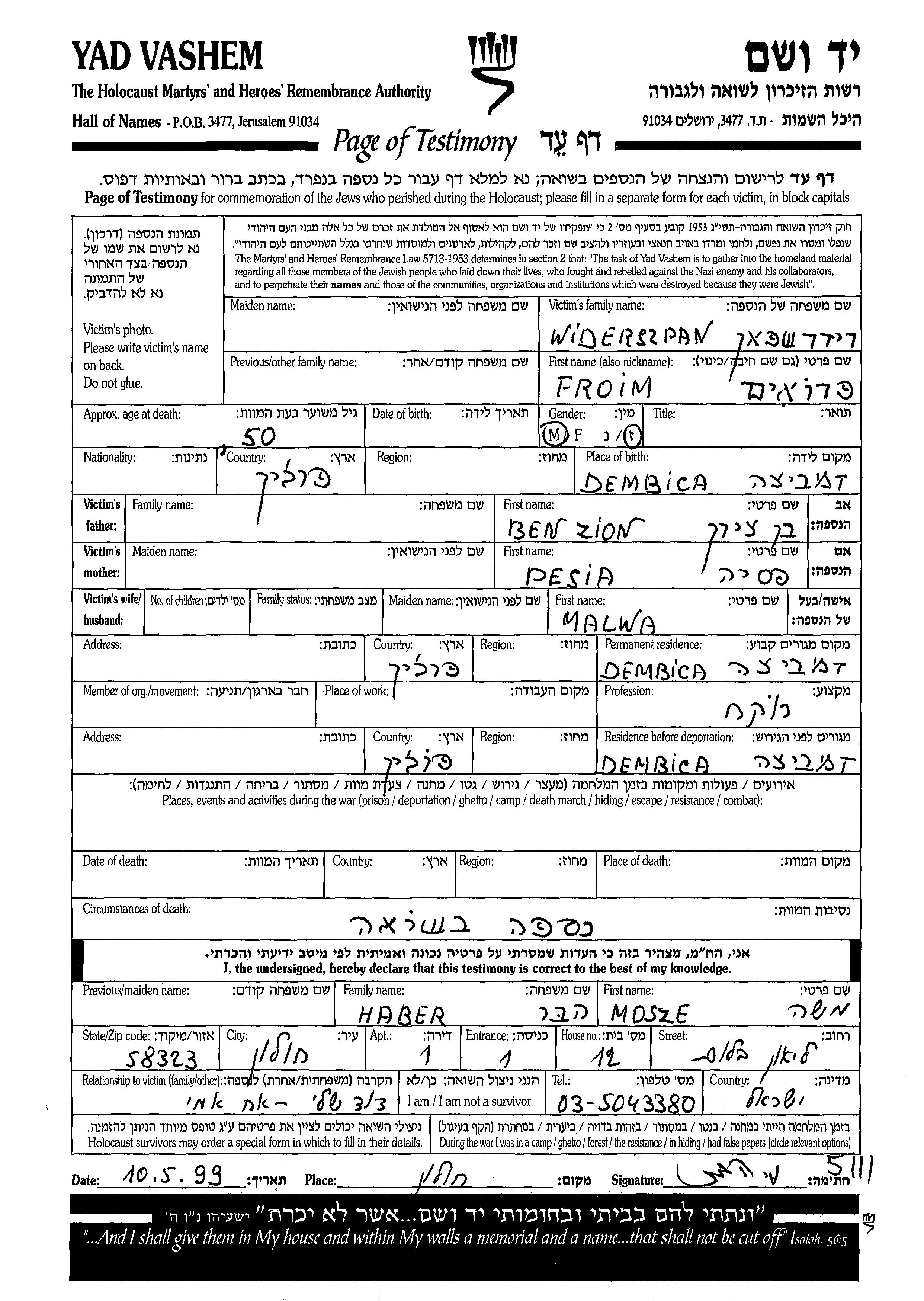 Видершпан Фроим Дембица, Польша Лист свидетельских показаний
