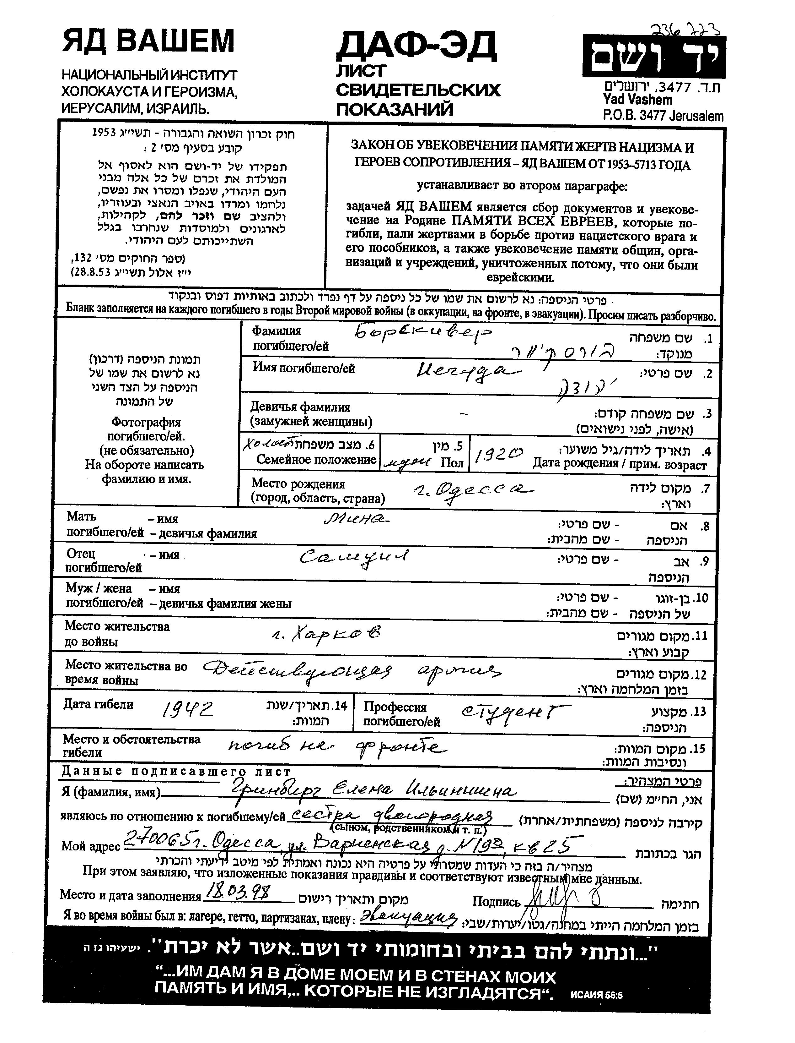 Борскивер Иегуда 1920 Харьков, Украина (СССР) Лист свидетельских показаний