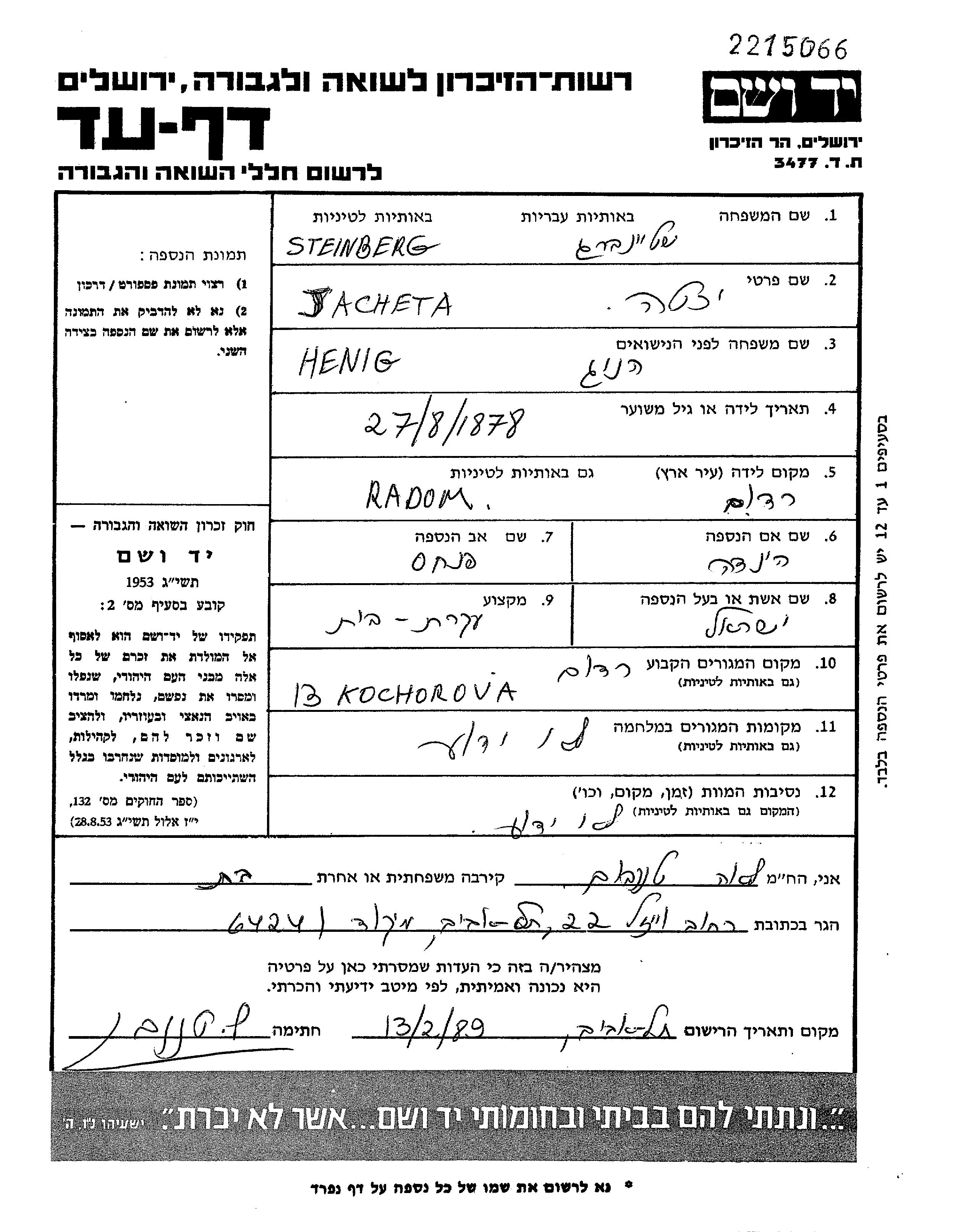 Штайнберг | Яхет | 1884 | Радом, Польша | Лист свидетельских показаний |