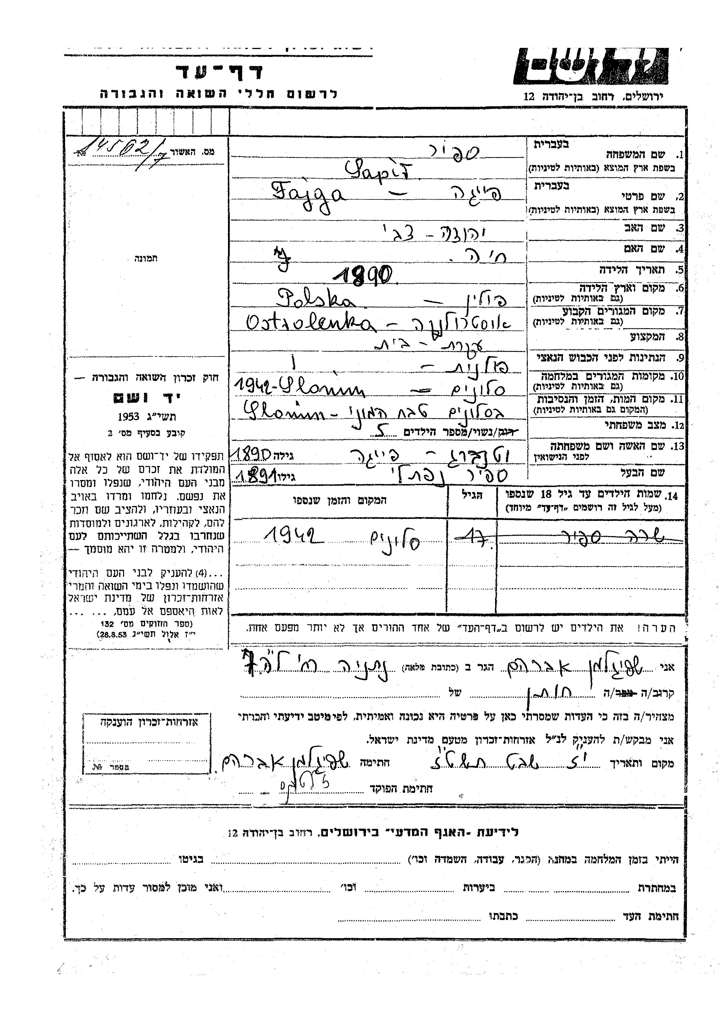 Сапир Файга 1890 Остроленка, Польша Лист свидетельских показаний