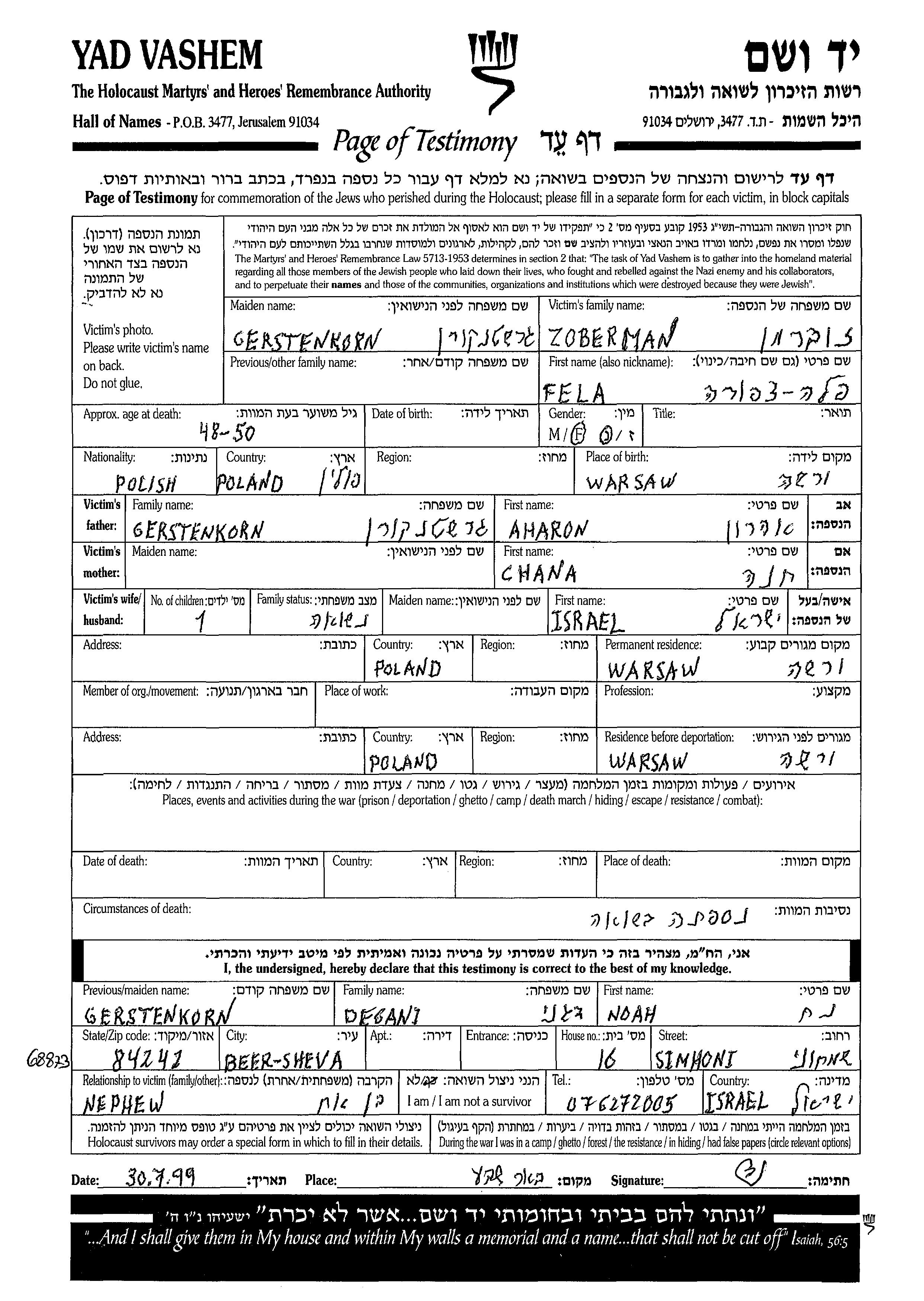 Зоберман Фела Варшава, Польша Лист свидетельских показаний