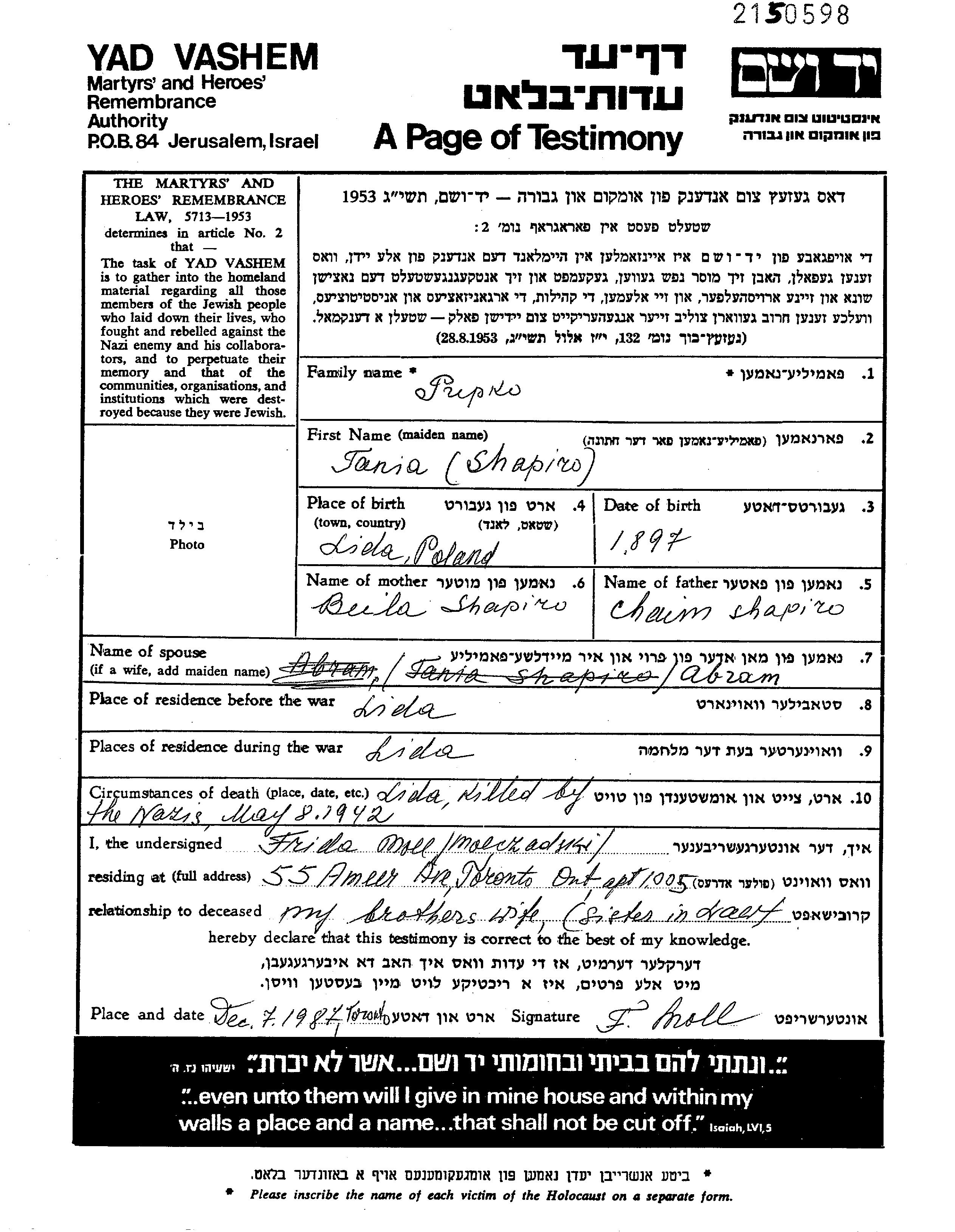Пупко Попко | Таня | Лида, Польша | Лист свидетельских показаний | |
