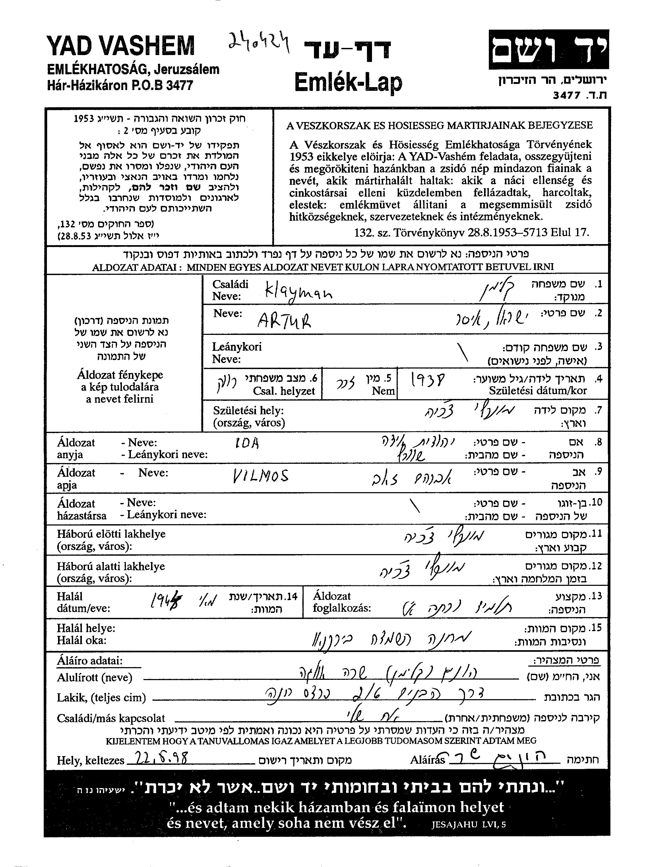 Клайман Исраэль Артур 1938 Мункач, Чехословакия Лист свидетельских показаний