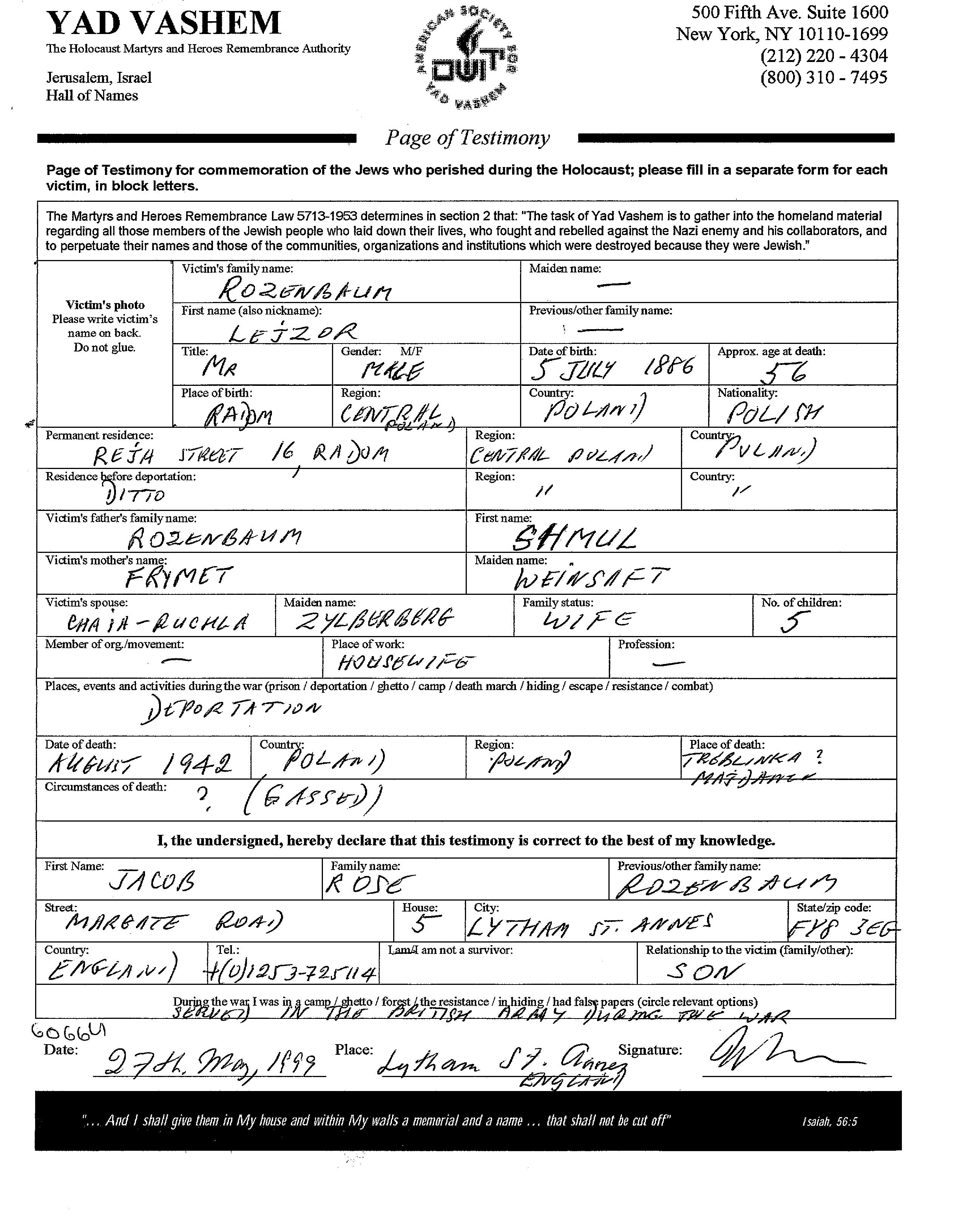 Розенбаум Лейзор 1886 Радом, Польша Лист свидетельских показаний