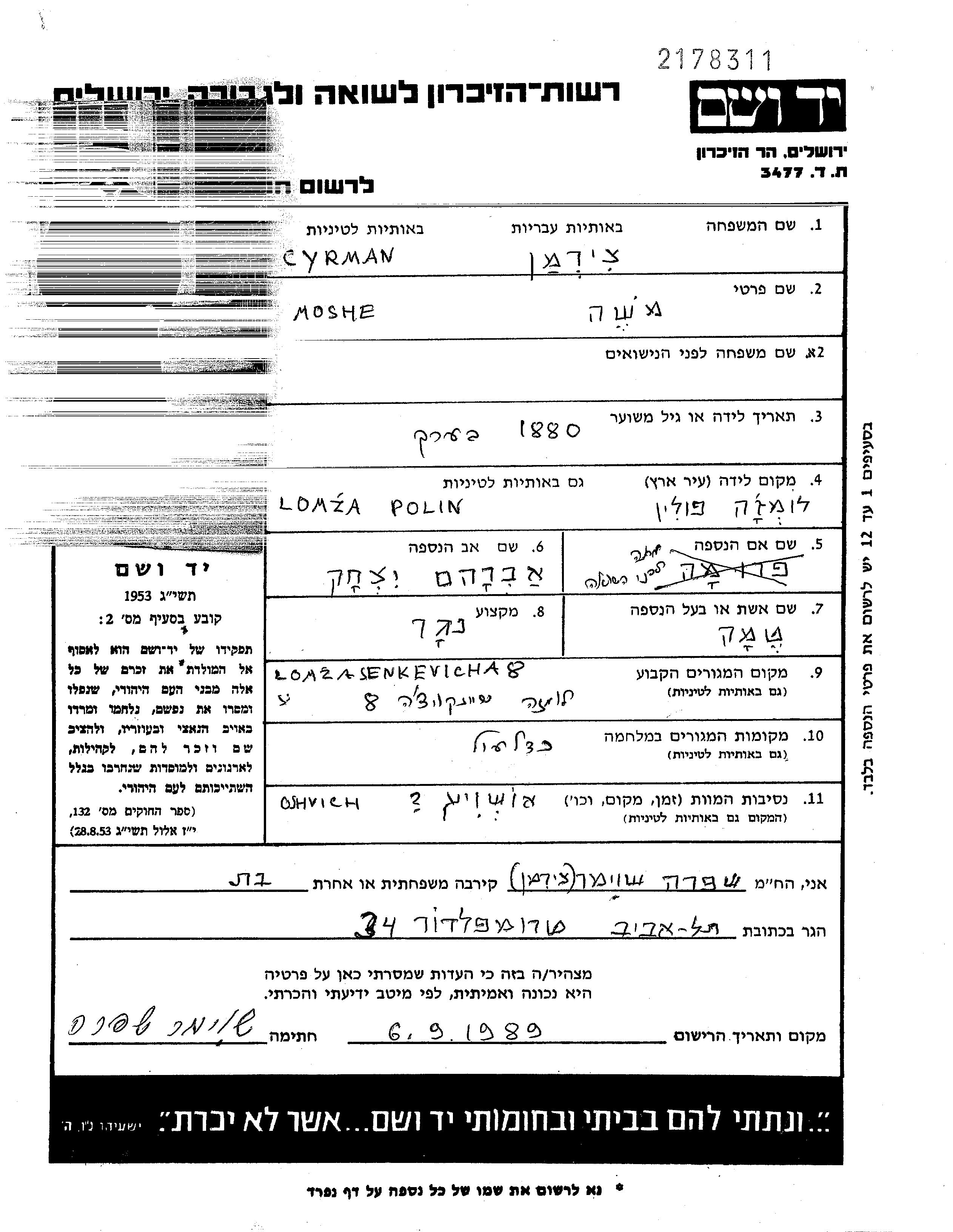 Цырман Моше Ломжа, Польша Лист свидетельских показаний