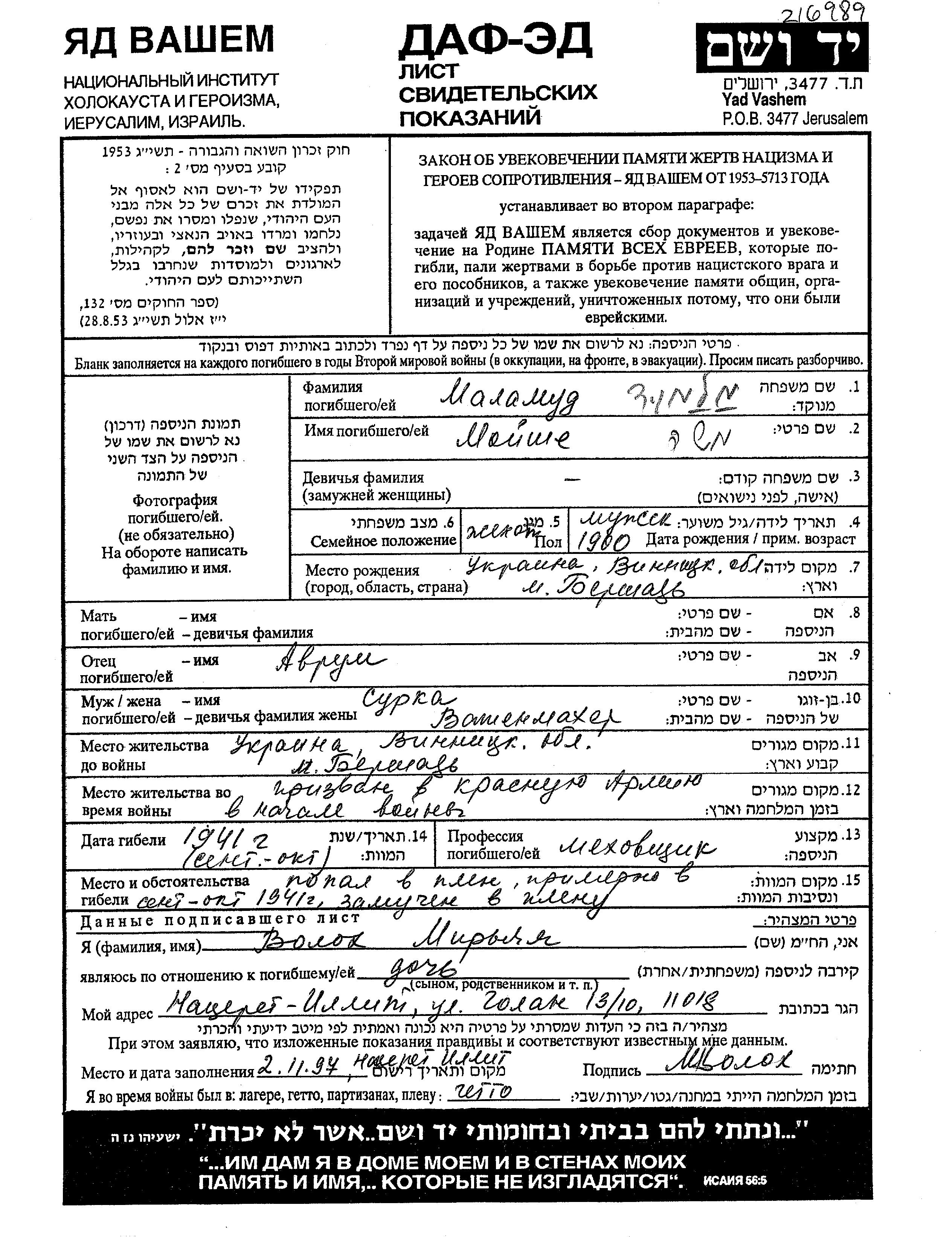 Маламуд Мойше 1900 Бершадь, Украина (СССР) Лист свидетельских показаний