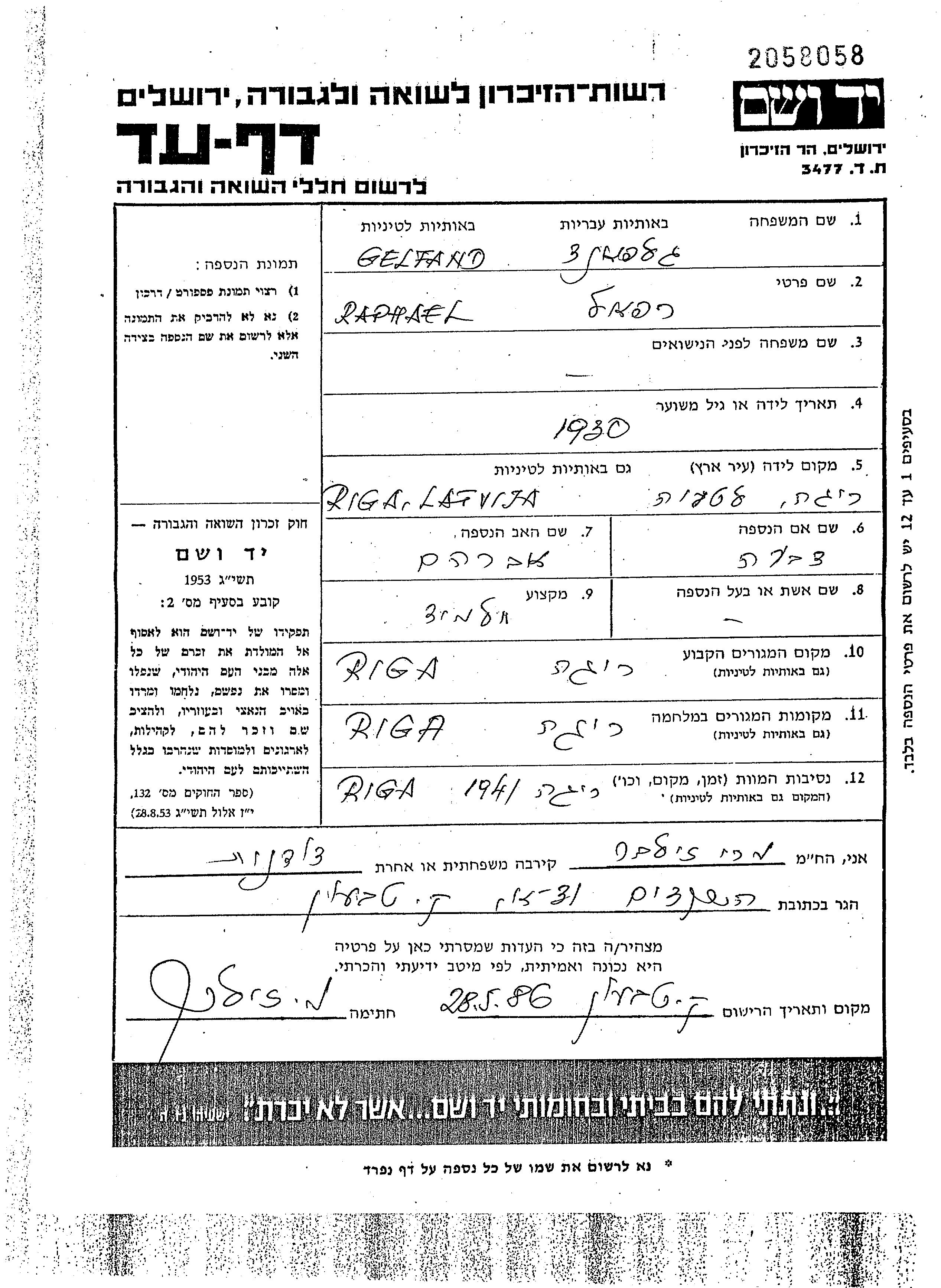 Гельфанд Рафаэль 1930 Рига, Латвия Лист свидетельских показаний