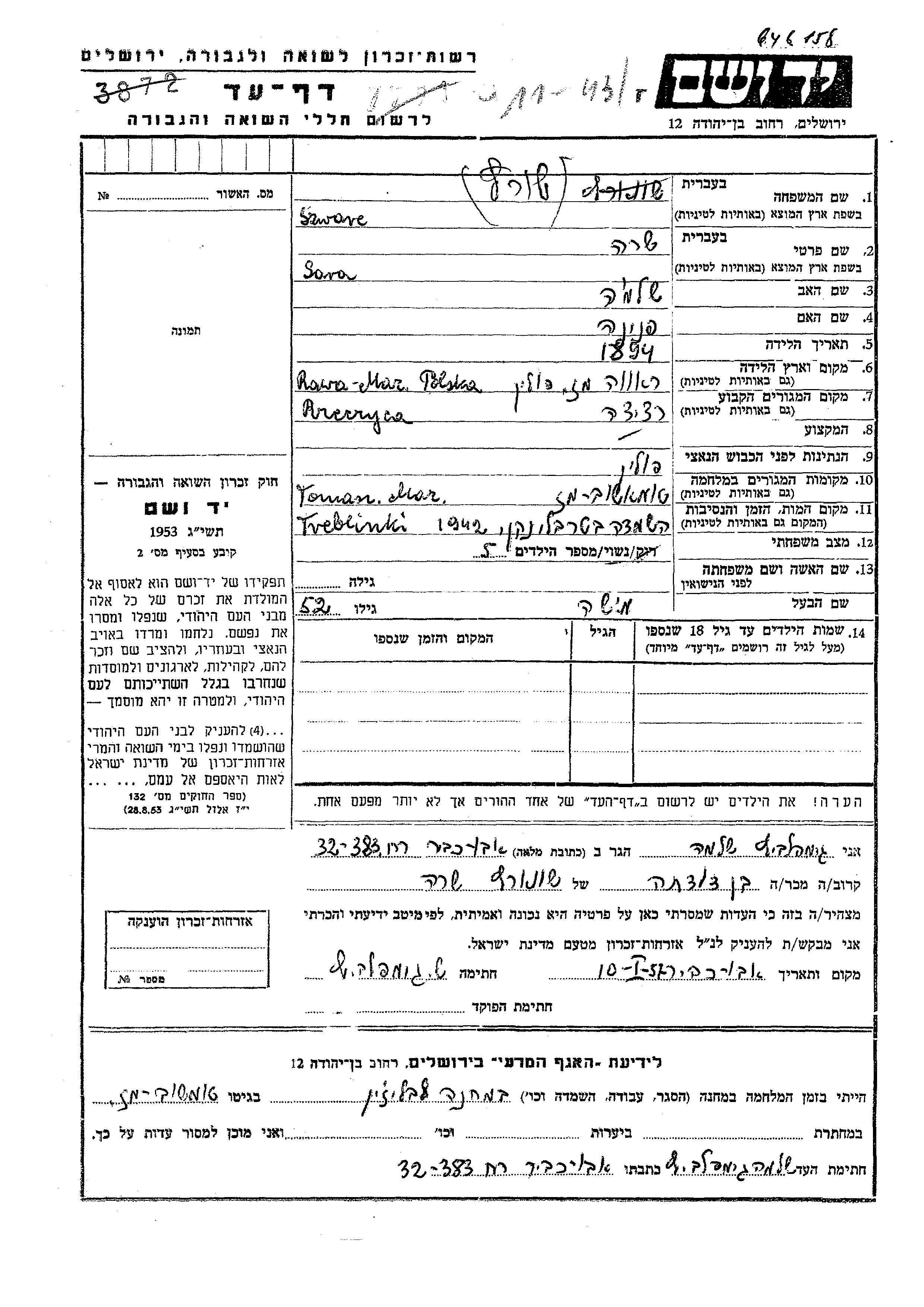 Сара Шварц, место рождения: Рава Мазовецка, Польша. Отец: Шломо, mать:Пнина. Женат / замужем. Место жительства до войны: Жечица, Польша. Место во время войны: Томашув-Мазовецки, Польша.