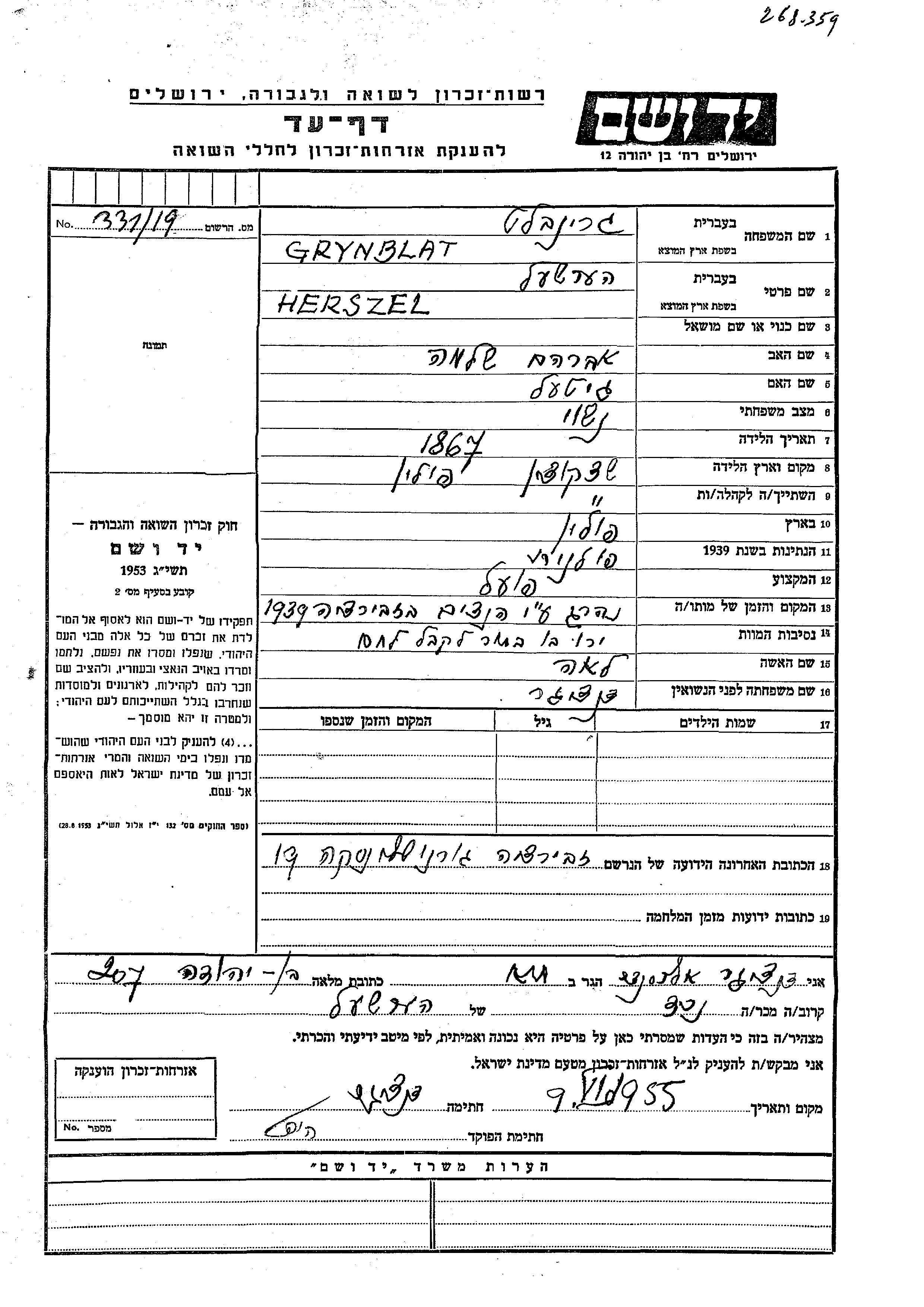Хершел Гринблат, место рождения: Щекоцин, Польша. Отец: Авраам Шломо, mать:Гитель. Рабочий / рабочая. Женат / замужем. Место жительства до войны: Щекоцин, Польша. Место во время войны: Заверце, Польша.