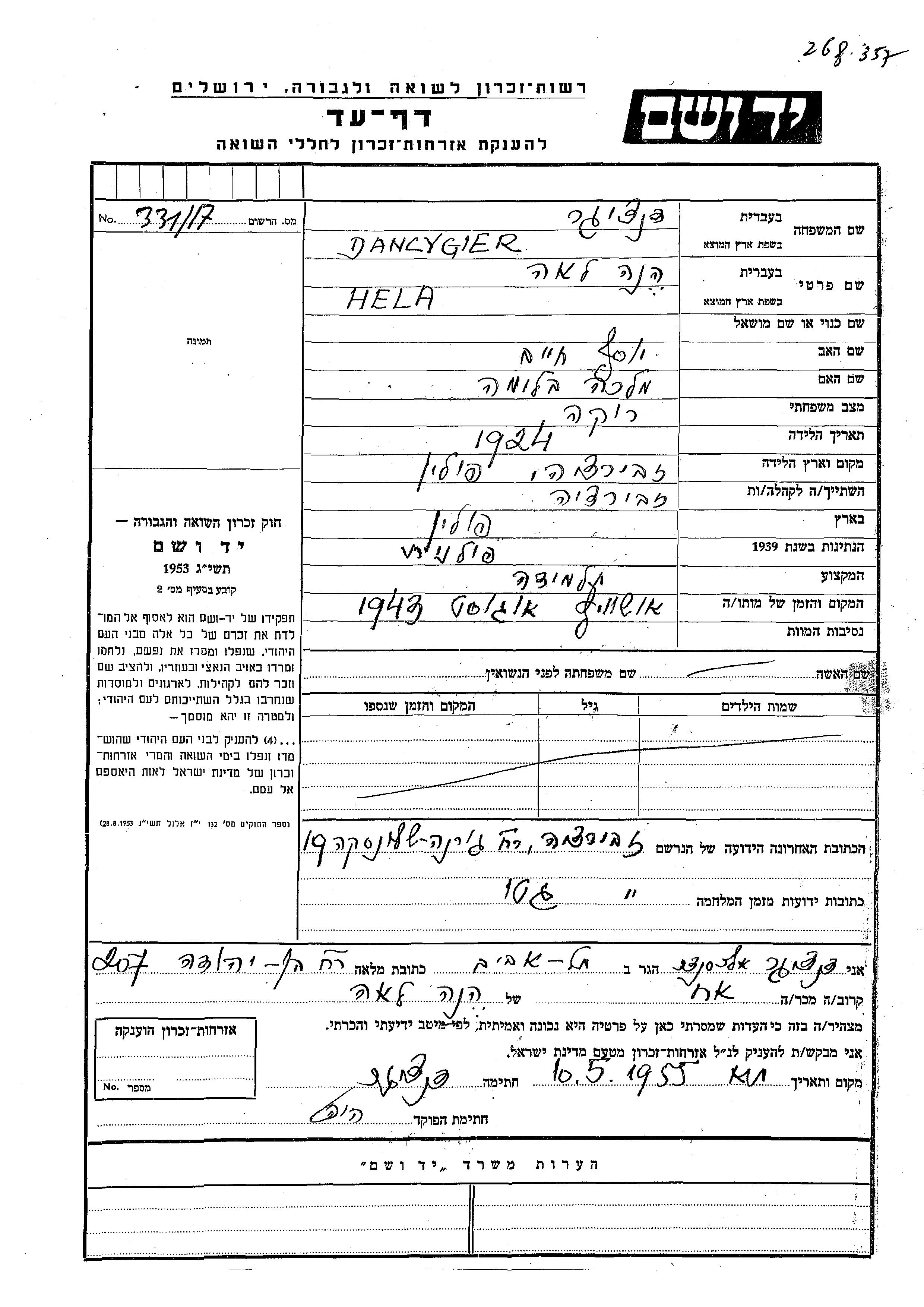 Хела Хена Лея Данцигер, место рождения: Заверце, Польша. Отец: Иосеф Хаим, mать:Малка Блюма. Ученик / ученица. Холост / не замужем. Место жительства до войны: Польша.