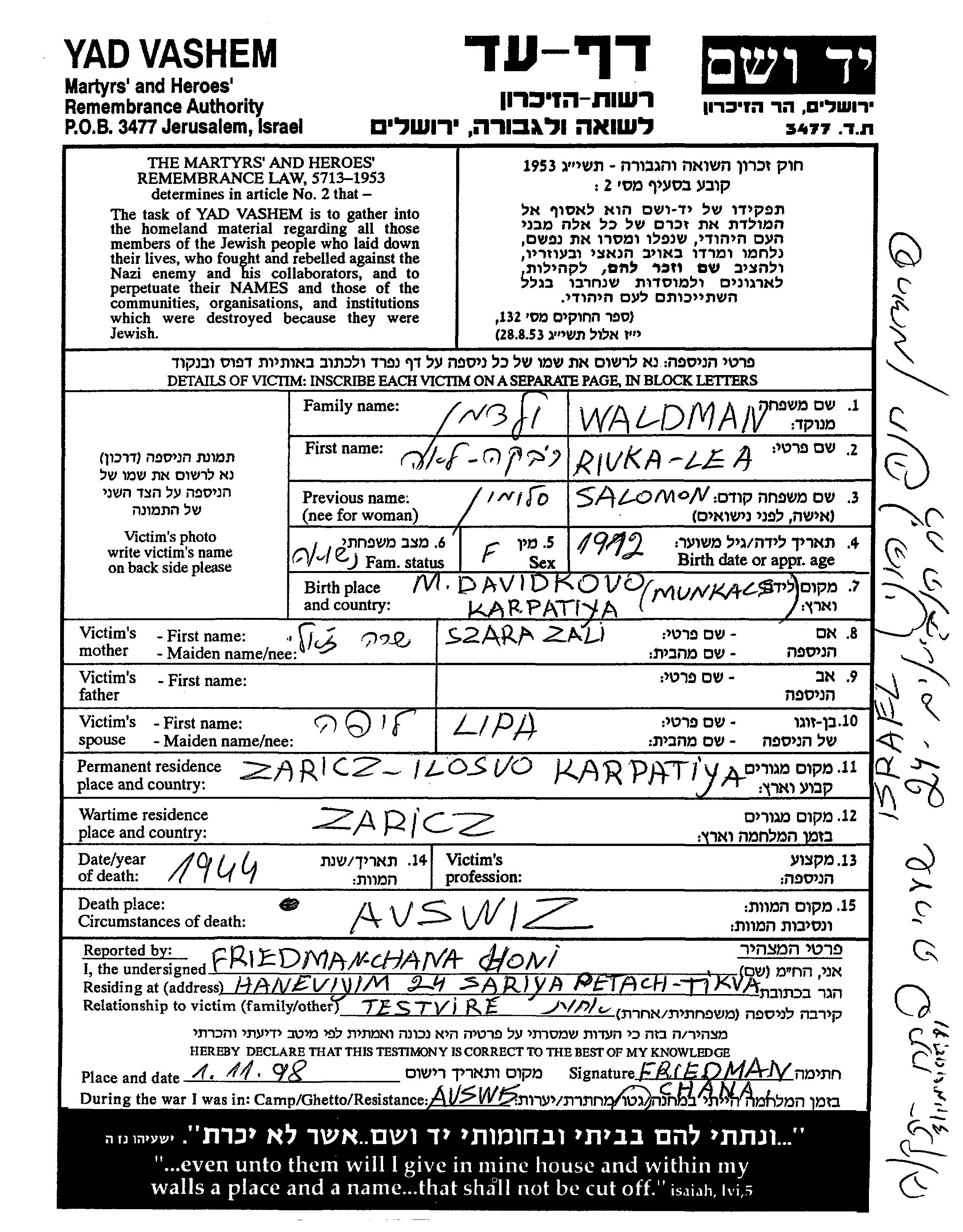 Ривка Лея Вальдман, девичья фамилия Саломон, место рождения: Мункач, Чехословакия.Mать:Сара Зали. Женат / замужем. Место жительства до войны: Зарича, Чехословакия. Место во время войны: Зарича, Чехословакия.