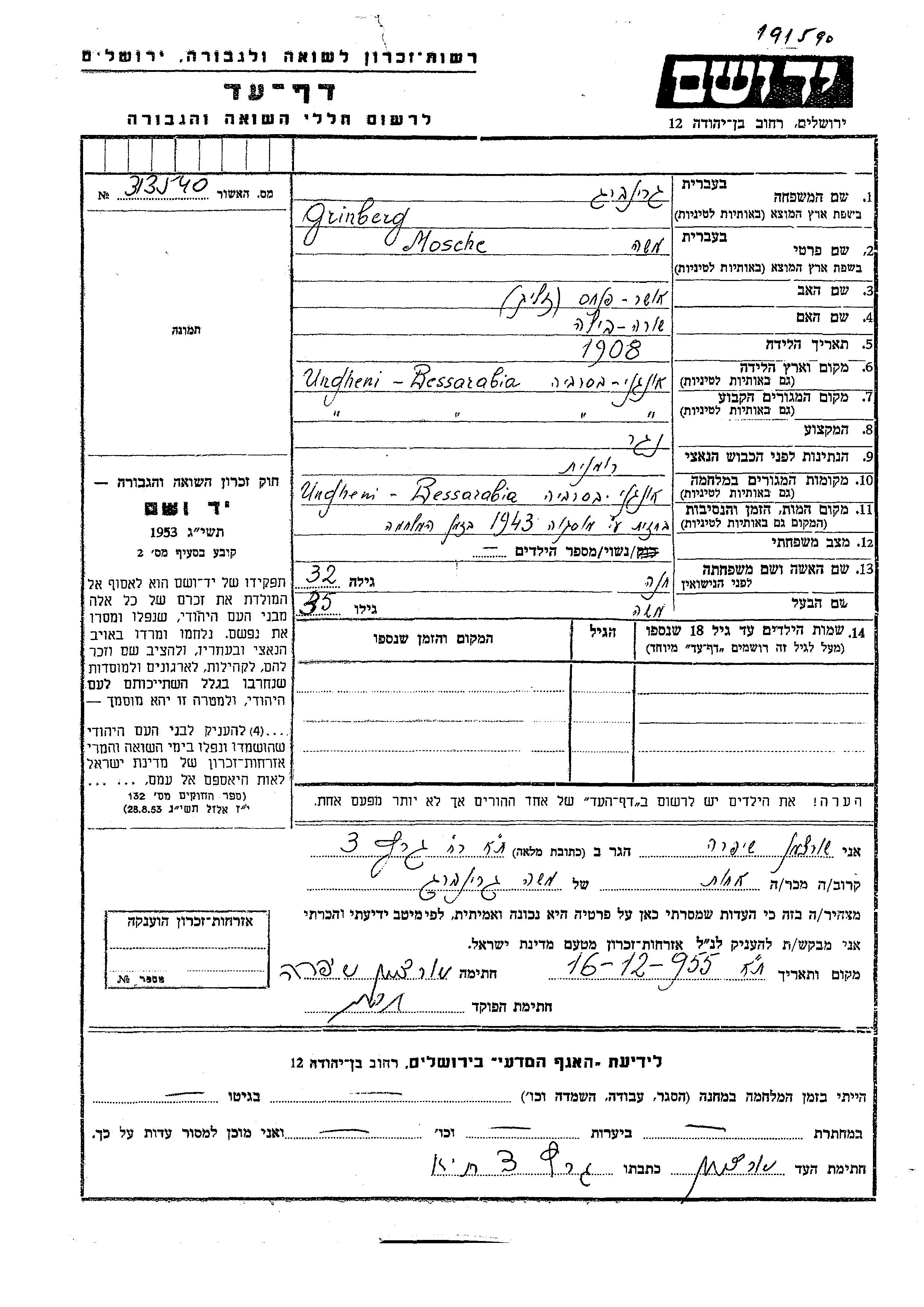 Гринберг Моше 1908 Унгень, Румыния Лист свидетельских показаний