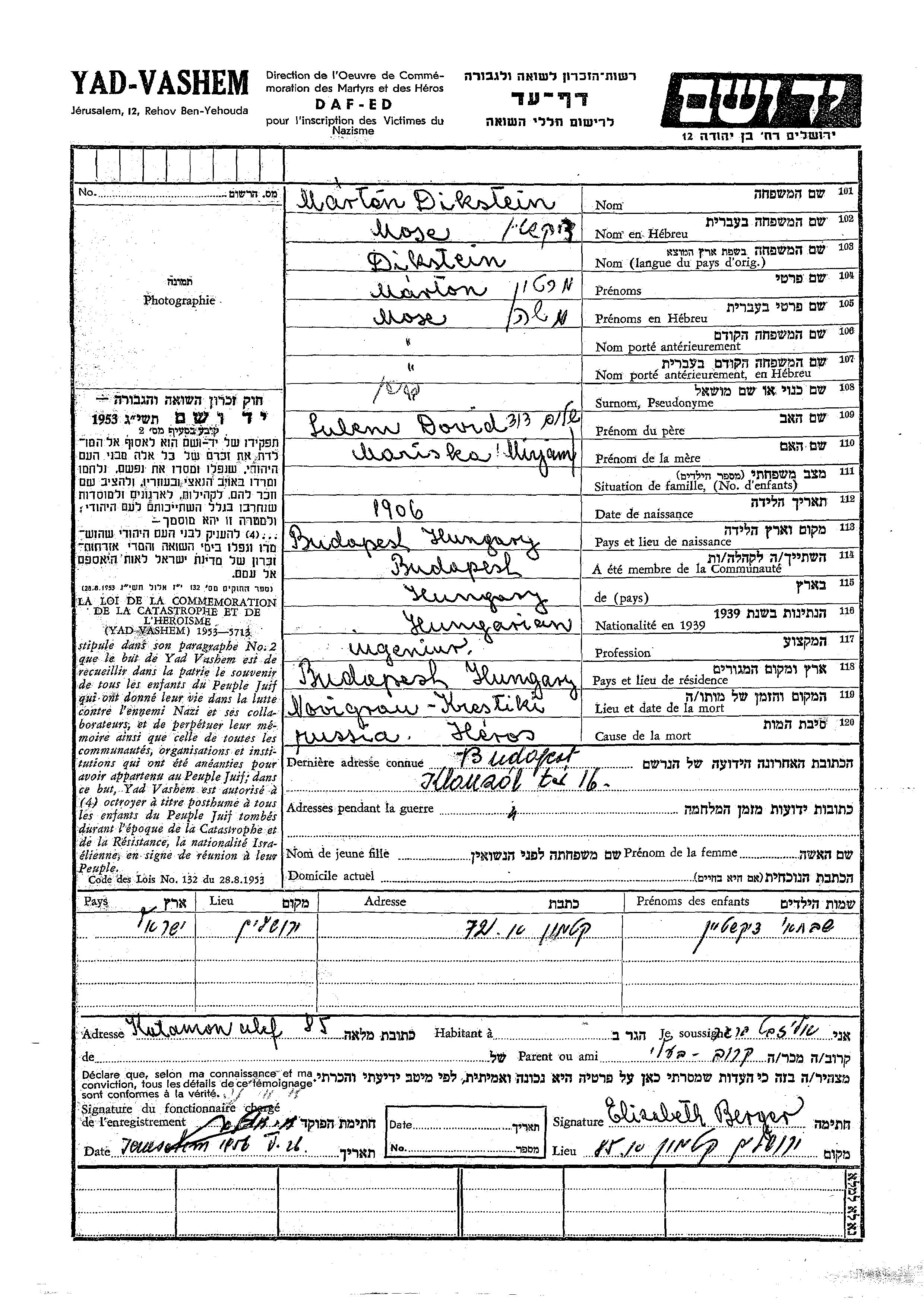 Моше Мартон Дикштейн, место рождения: Будапешт, Венгрия. Отец: Шулем Довид, mать:Мариска Мирьям. Инженер. Место жительства до войны: Будапешт, Венгрия. Место во время войны: Будапешт, Венгрия.