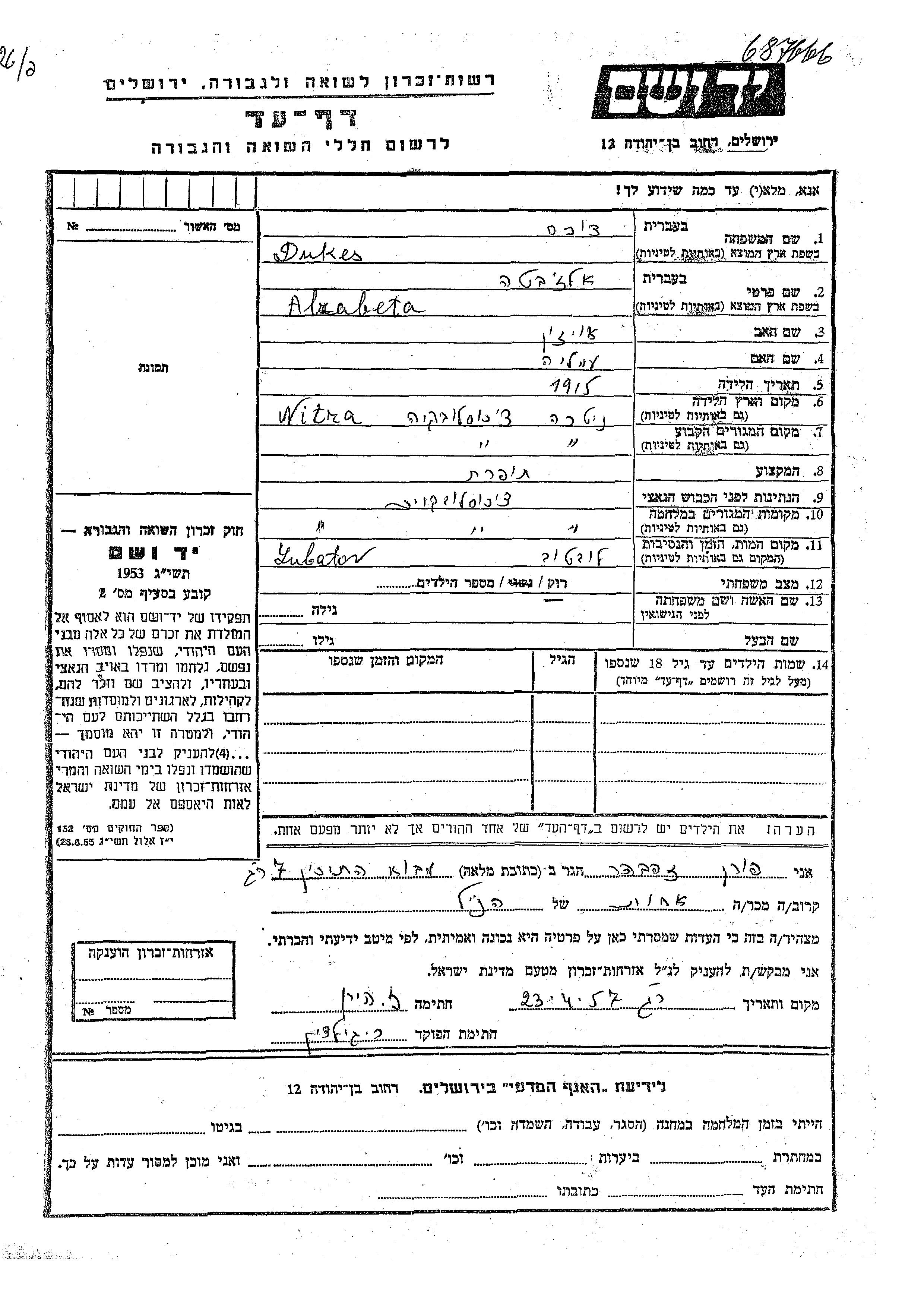 Алзабета Дукес, место рождения: Нитра, Чехословакия. Отец: Ойжен, mать:Амалия. Швея. Холост / не замужем. Место жительства до войны: Нитра, Чехословакия. Место во время войны: Нитра, Чехословакия.