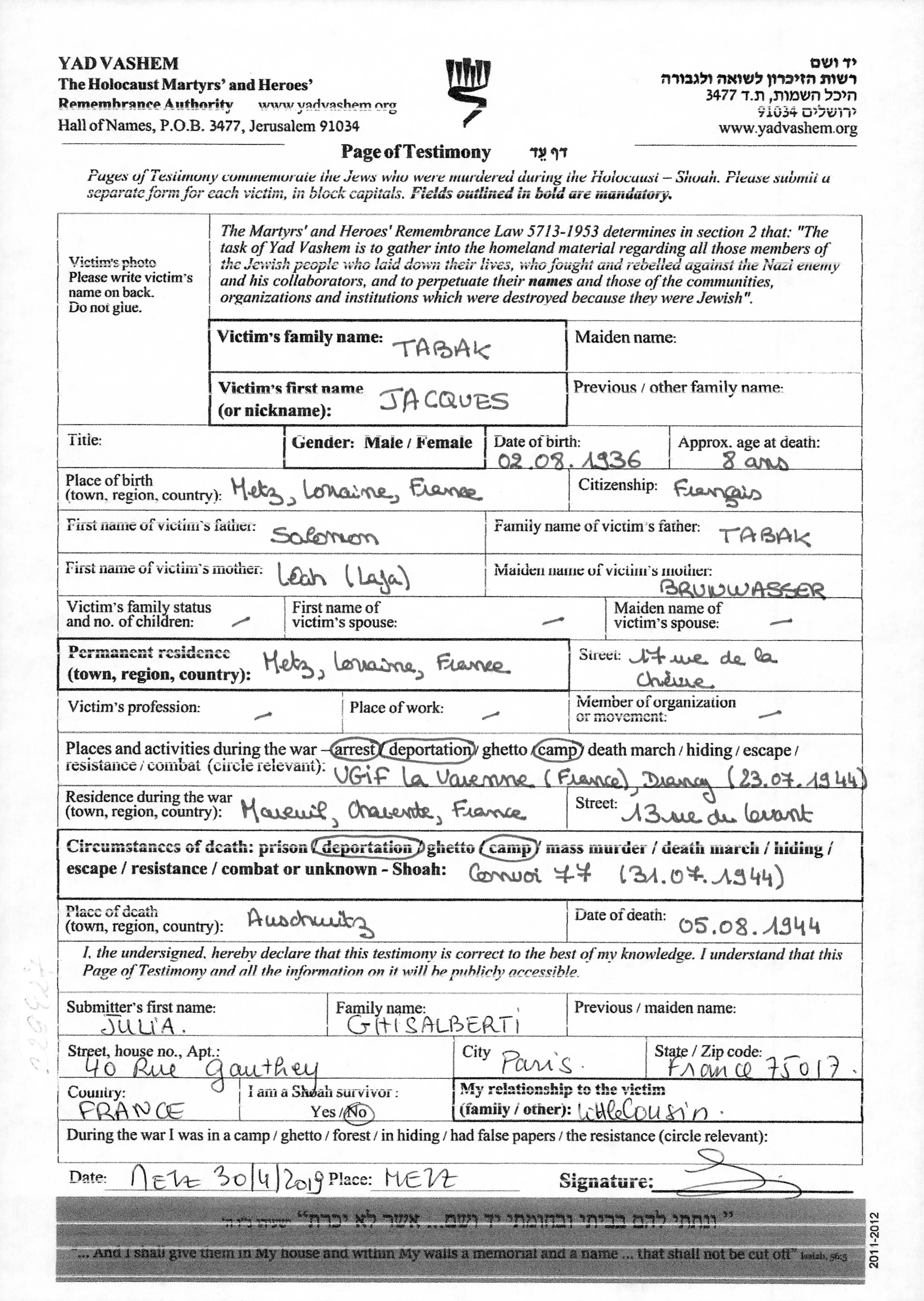 Жак Табак, место рождения: Мец, Франция. Отец: Саломон, mать:Léah, девичья фамилия Брунвассер. Ребенок. Место жительства до войны: Мец, Франция. Место во время войны: Дранси, Франция. Депортация: Transport 77 from Дранси,ЛАГЕРЬ,Франция to Аушвиц Биркенау,лагерь смерти,Польша on 31/07/1944.
