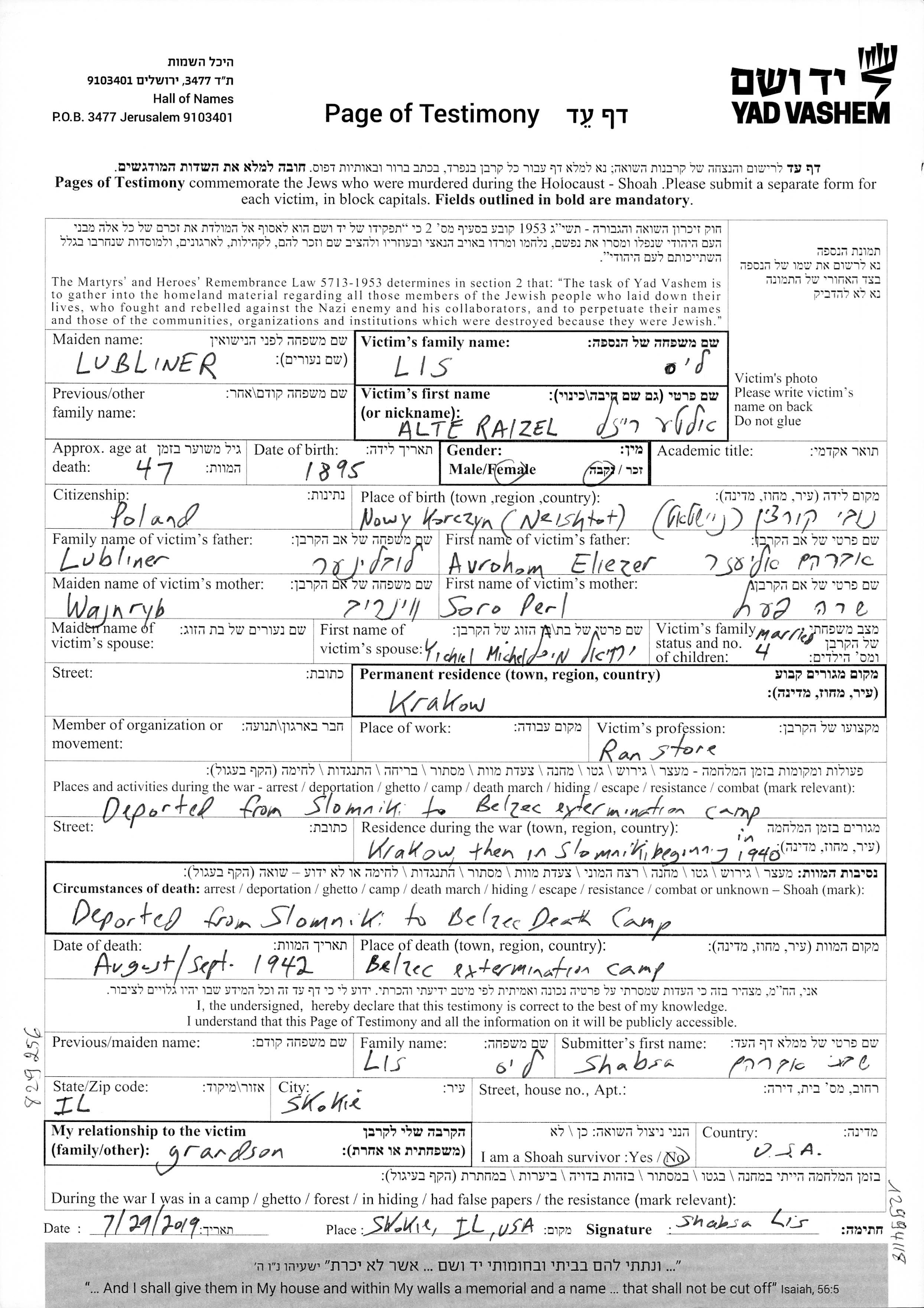 Алте Райзел Лис, девичья фамилия Люблинер, место рождения: Новый Корчин, Польша. Отец: Аврохом Элиэзер, mать:Соро Перл, девичья фамилия Вайнрыб. Владелец / владелица магазина. Женат / замужем. Место жительства до войны: Краков, Польша. Место во время войны: Краков, Польша.