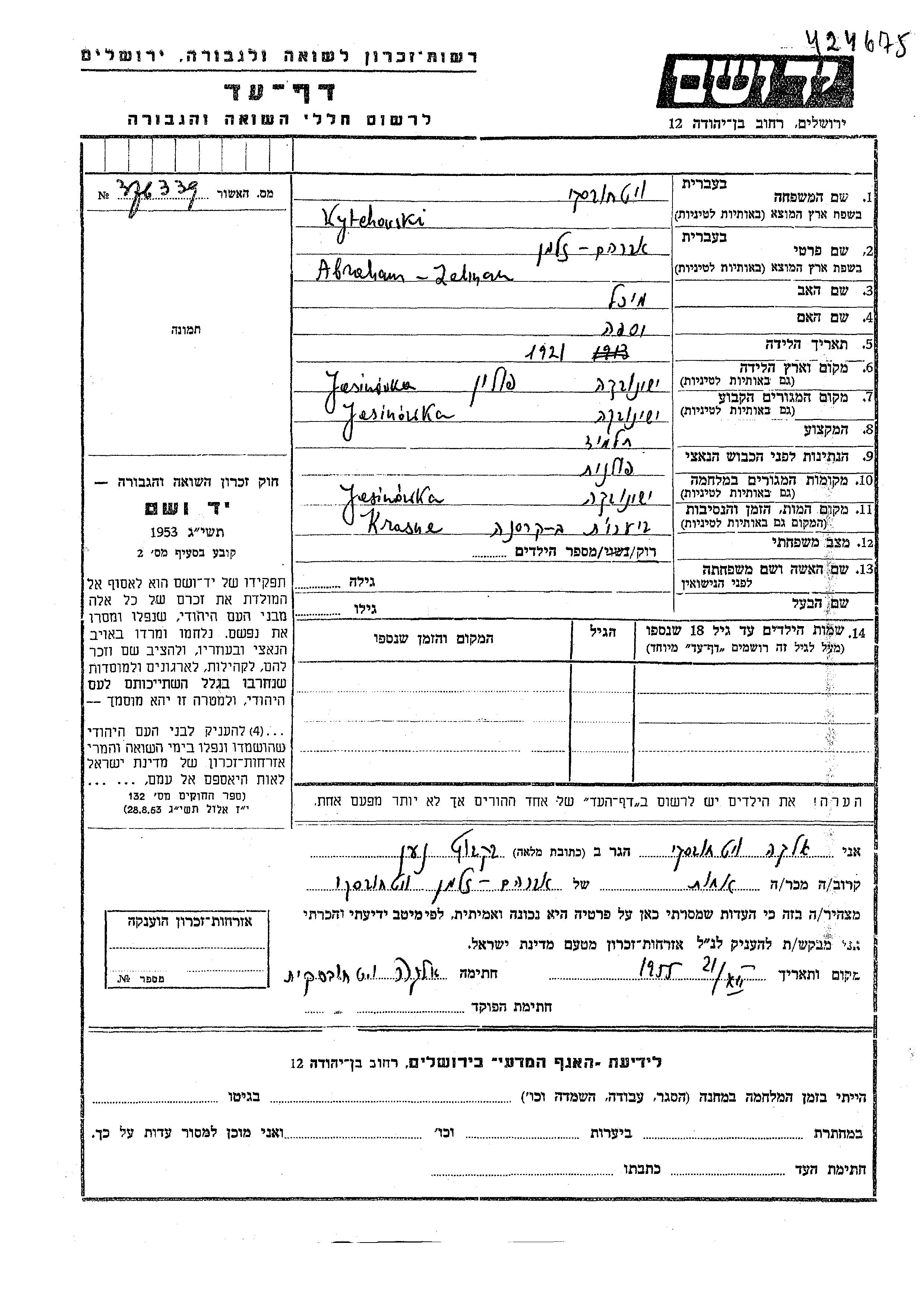 Абраам Зельман Вытховски, место рождения: Ясёнувка, Польша. Отец: Михель, mать:Йоспе. Ученик / ученица. Холост / не замужем. Место жительства до войны: Ясёнувка, Польша. Место во время войны: Ясёнувка, Польша.