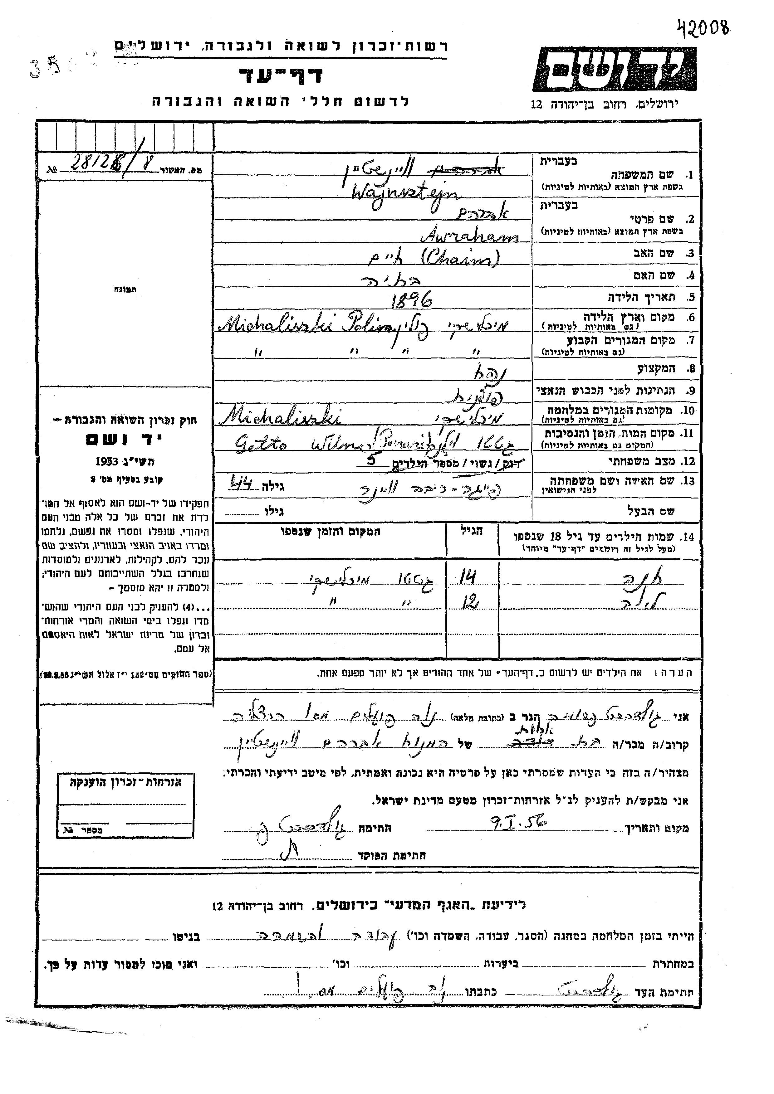 Авраам Вайнштейн, место рождения: Михалишки, Польша. Отец: Хаим, mать:Батья. Кузнец. Женат / замужем. Место жительства до войны: Михалишки, Польша. Место во время войны: Михалишки, Польша.