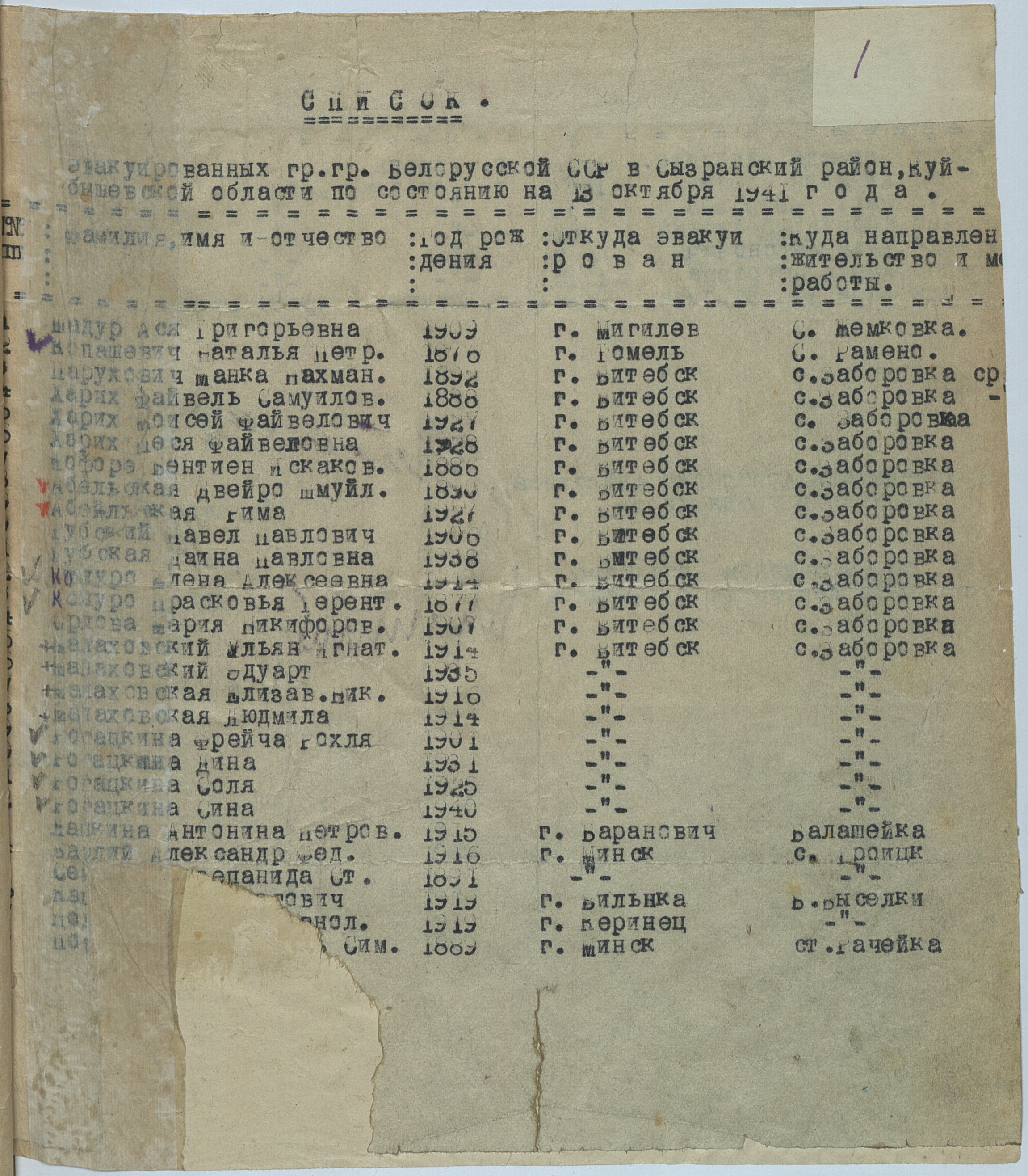 | Рогацкина | Фрейча Рохля | 1901 | Витебск, Белоруссия (СССР) | Список эвакуированных |
