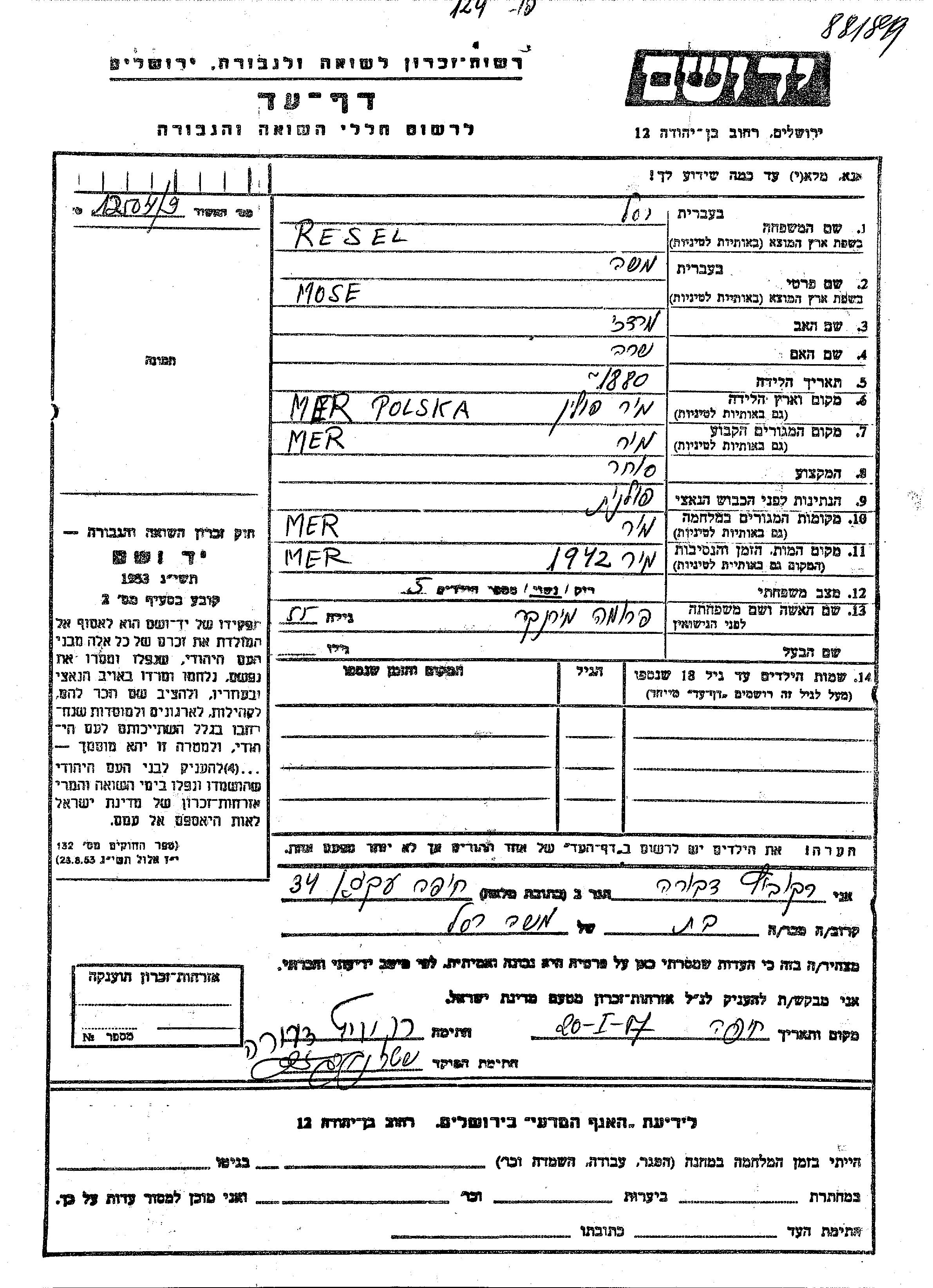 Моше Ресел, место рождения: Мир, Польша. Отец: Мордехай, mать:Сара. Торговец / торговка. Женат / замужем. Место жительства до войны: Мир, Польша. Место во время войны: Мир, Польша.