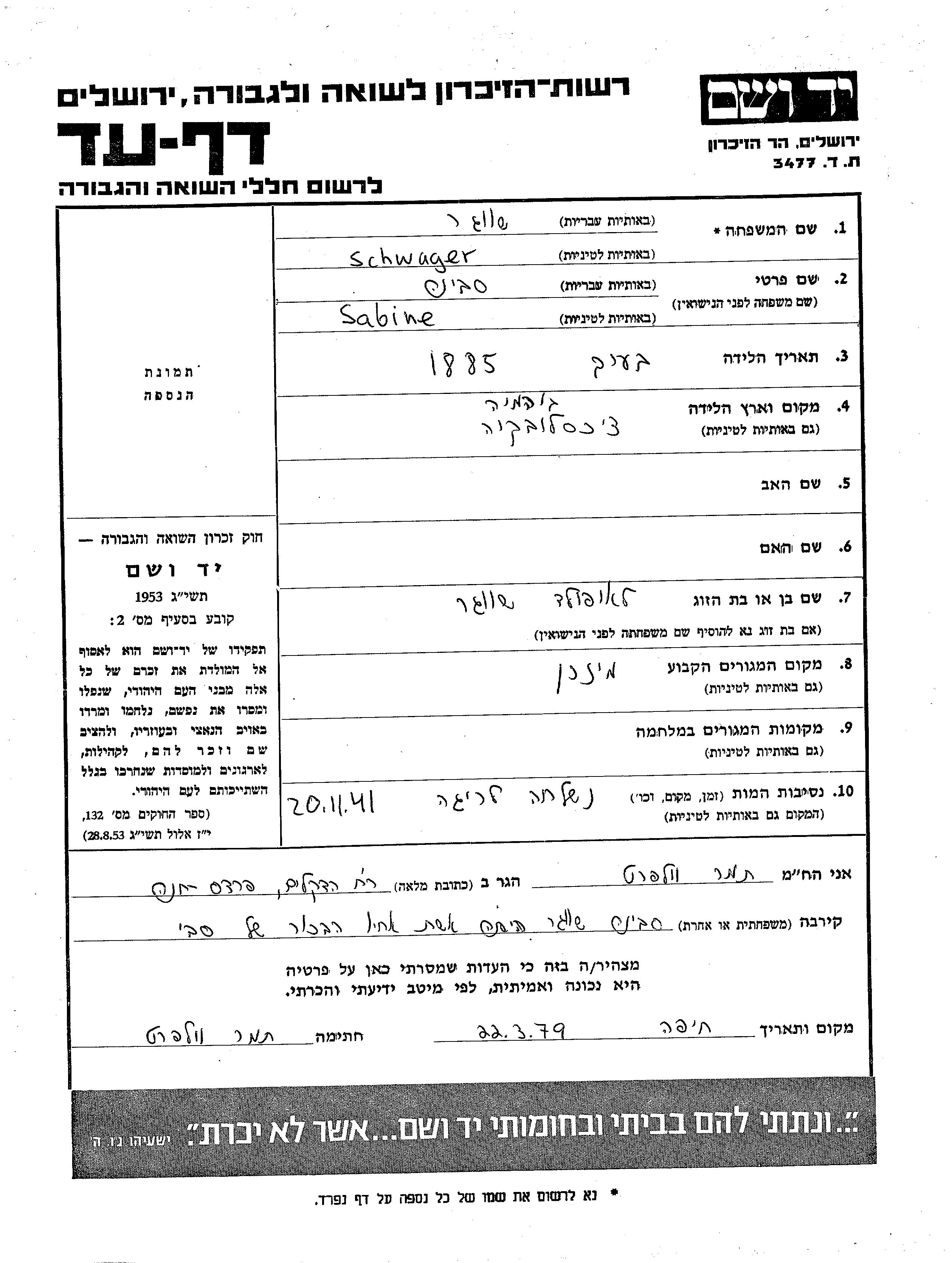 Сабине Швагер, место рождения: Богемия, Чехословакия. Женат / замужем. Место жительства до войны: Мюнхен, Германия.