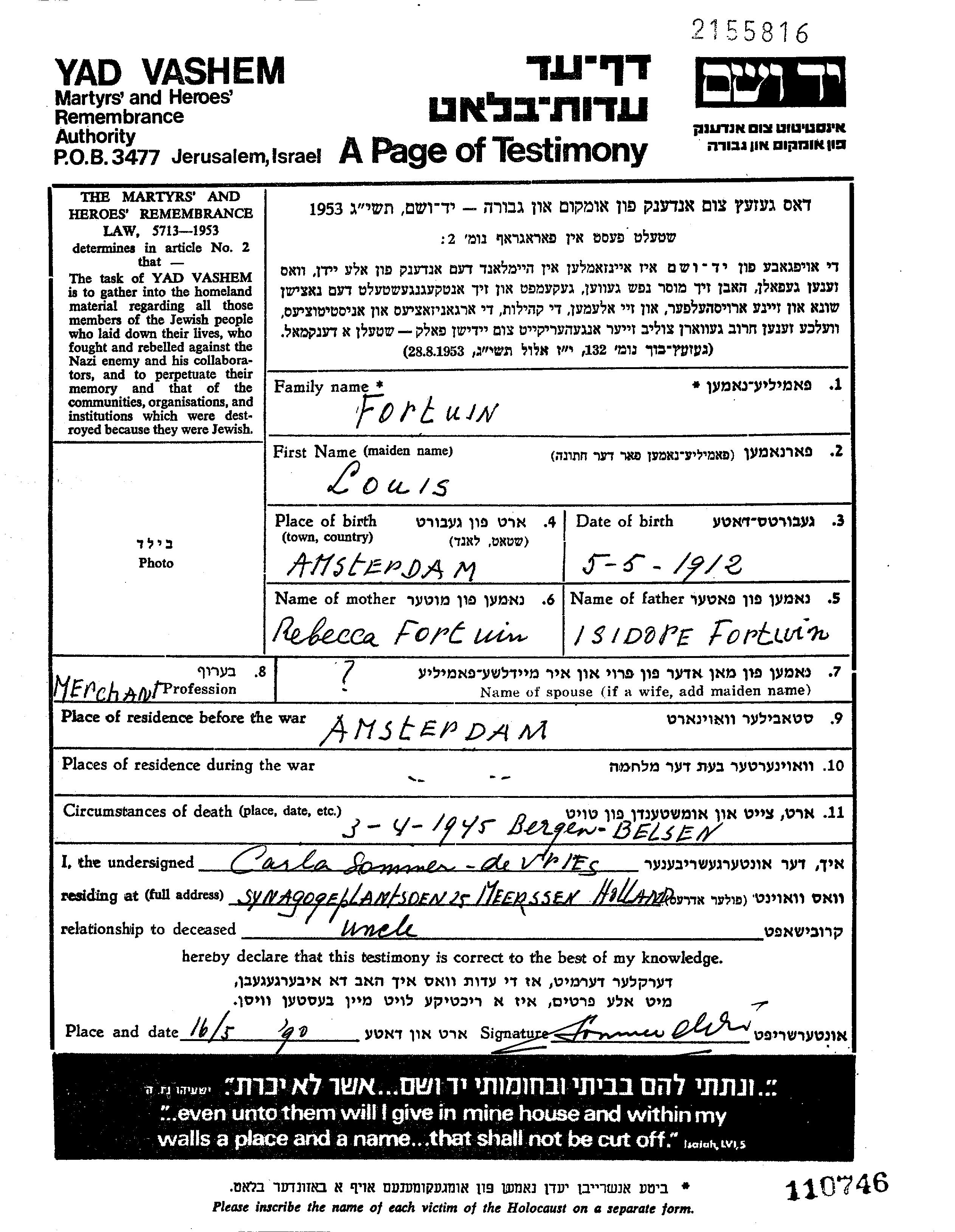 Луис Фортейн, место рождения: Амстердам, Нидерланды. Торговец / торговка. Место жительства до войны: Амстердам, Нидерланды.