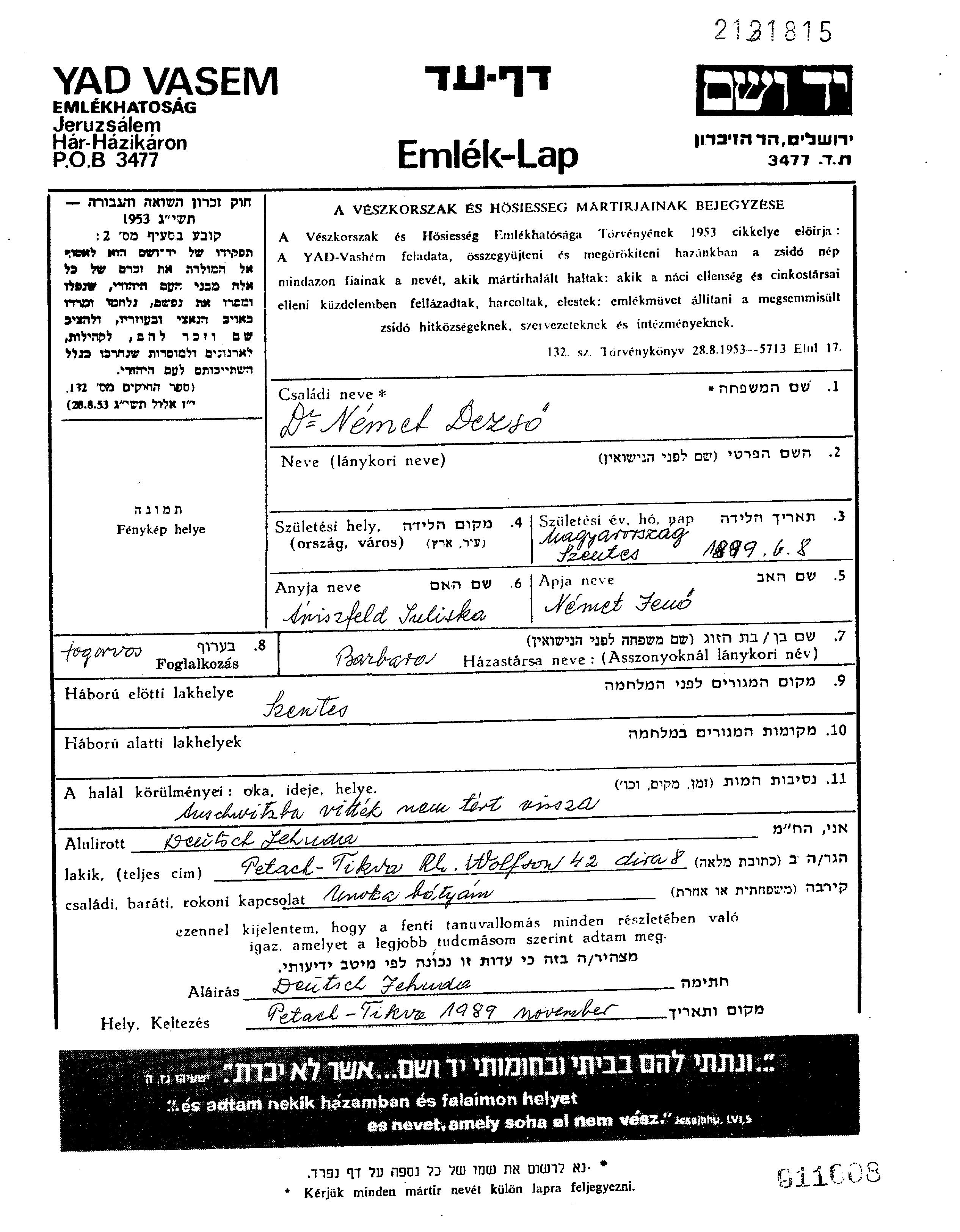 Дежо Немет Дойч, место рождения: Сентеш, Венгрия. Зубной врач. Место жительства до войны: Сентеш, Венгрия.