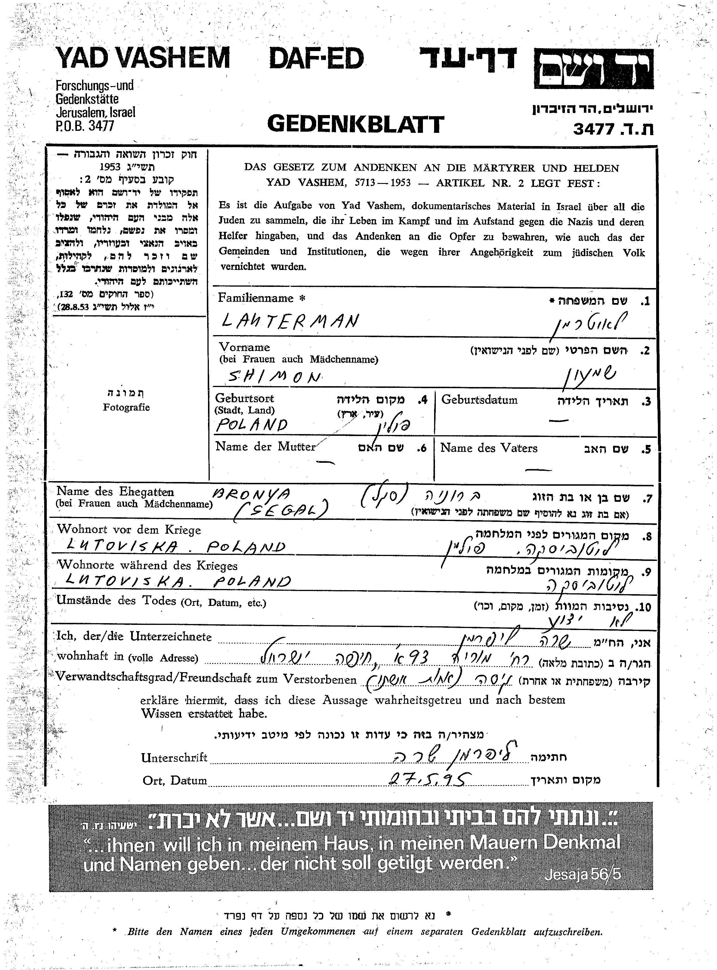 Шимон Лаутерман, место рождения: Польша. Женат / замужем. Место жительства до войны: Лютовиска, Польша. Место во время войны: Лютовиска, Польша.