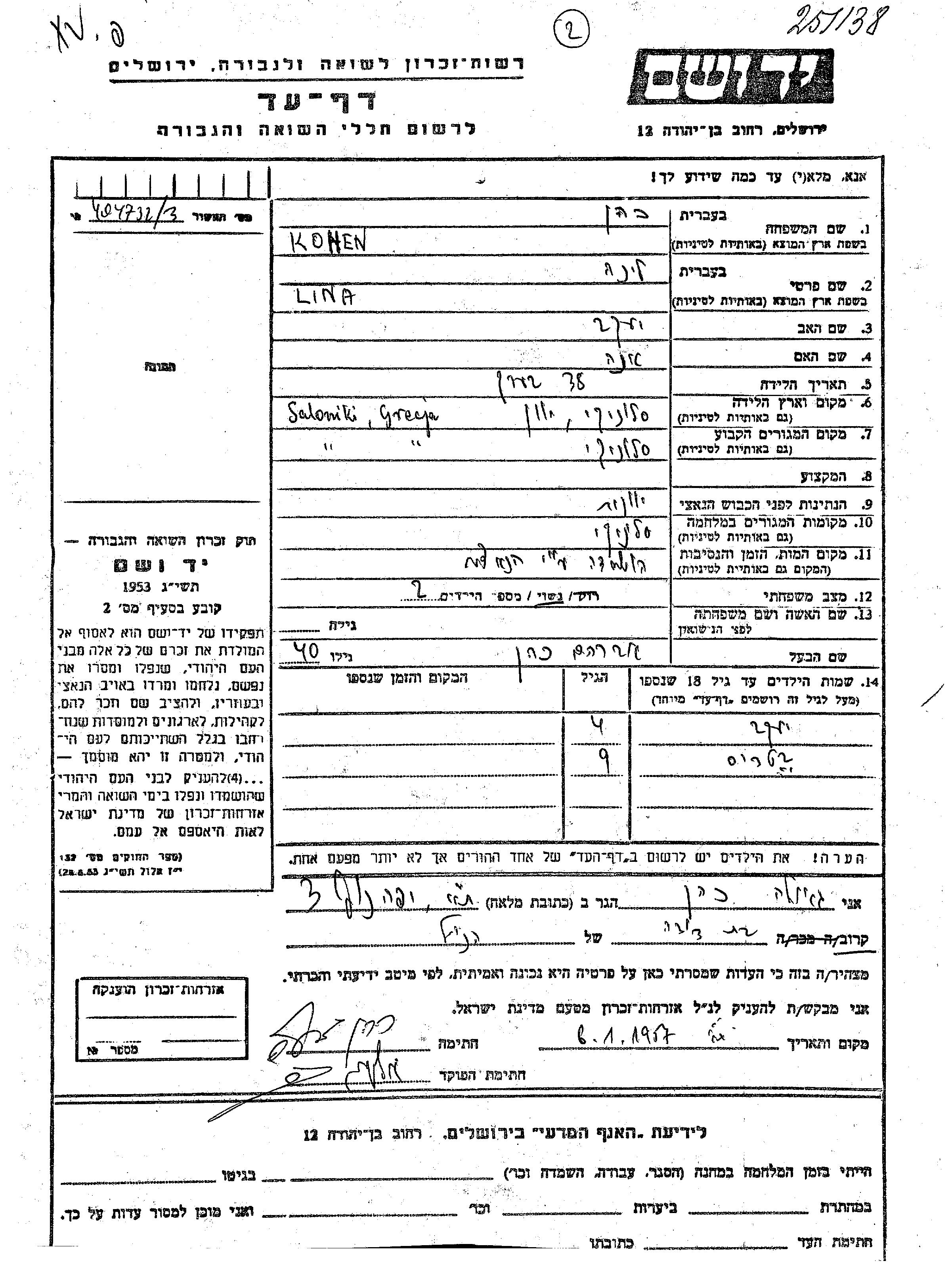 Лина Коэн, место рождения: Салоники, Греция. Отец: Яков, mать:Ана. Женат / замужем. Место жительства до войны: Салоники, Греция. Место во время войны: Салоники, Греция.