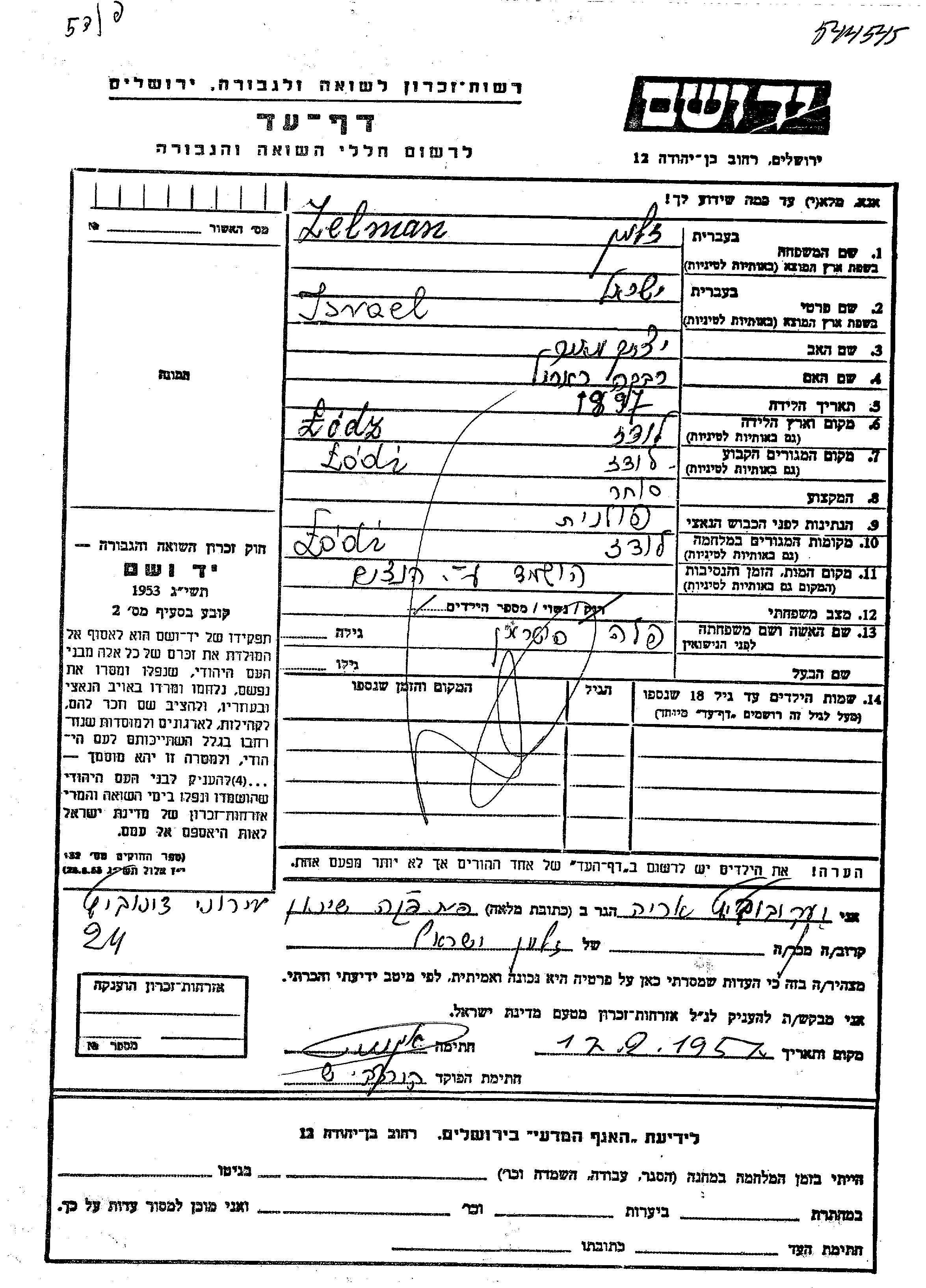 Зельман Исраэль 1897 Лодзь, Польша Лист свидетельских показаний