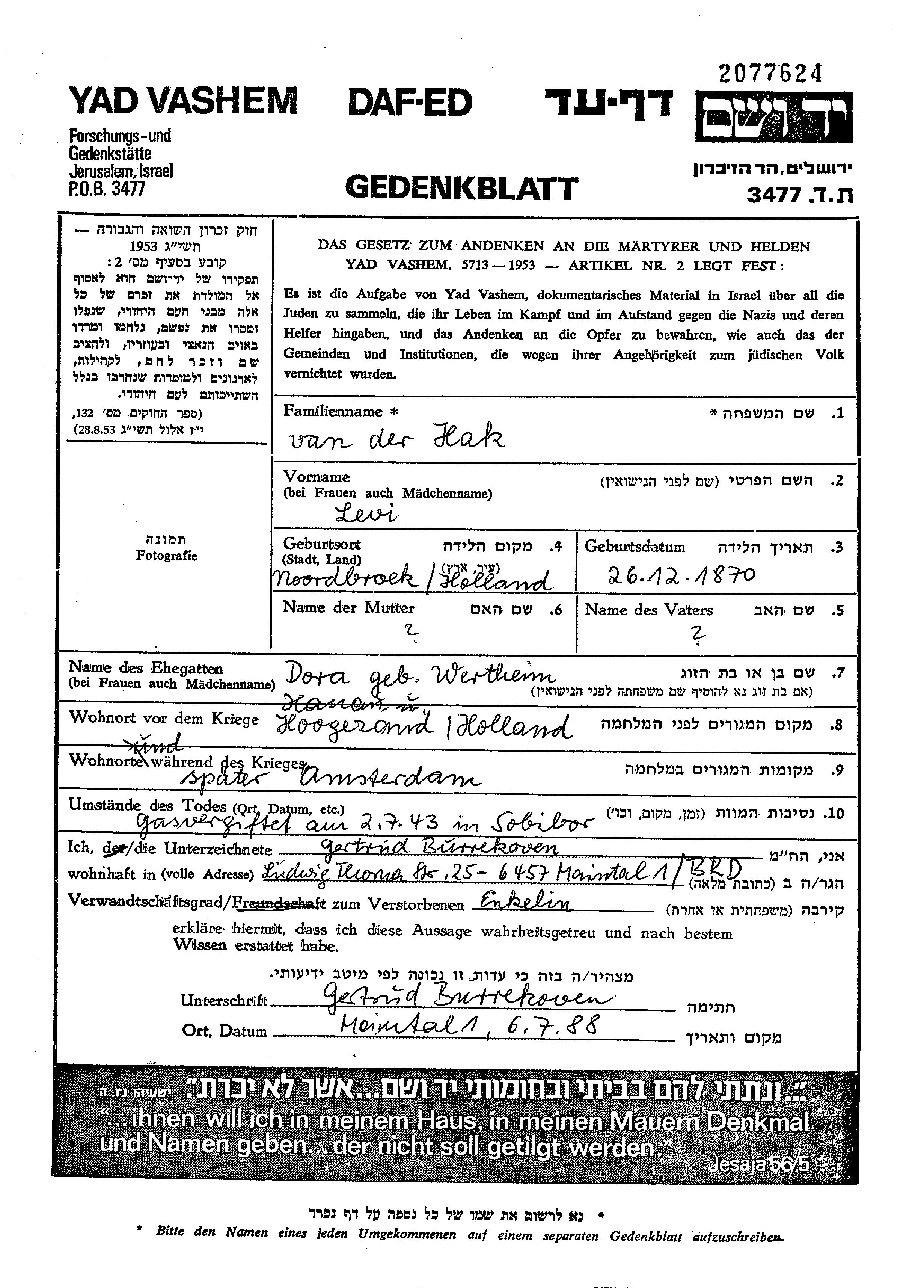 Леви Хак ван дер, место рождения: Нордбрук, Нидерланды. Место жительства до войны: Ханау, Германия.