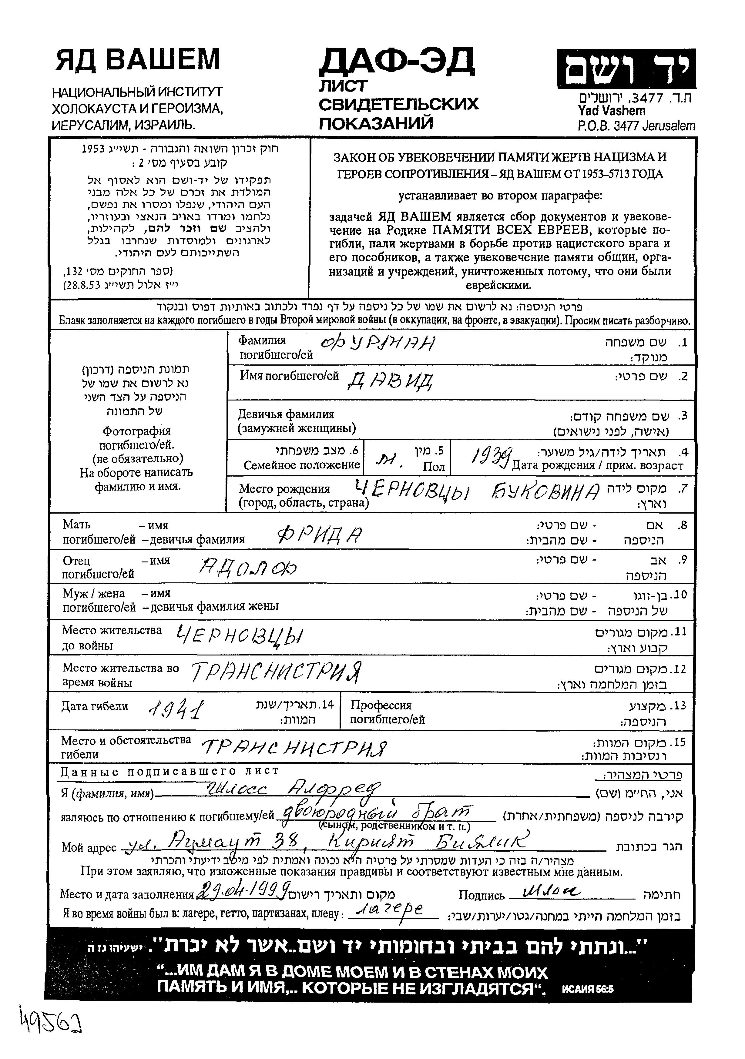 Фурманн Давид 1940 Черновцы, Румыния Лист свидетельских показаний
