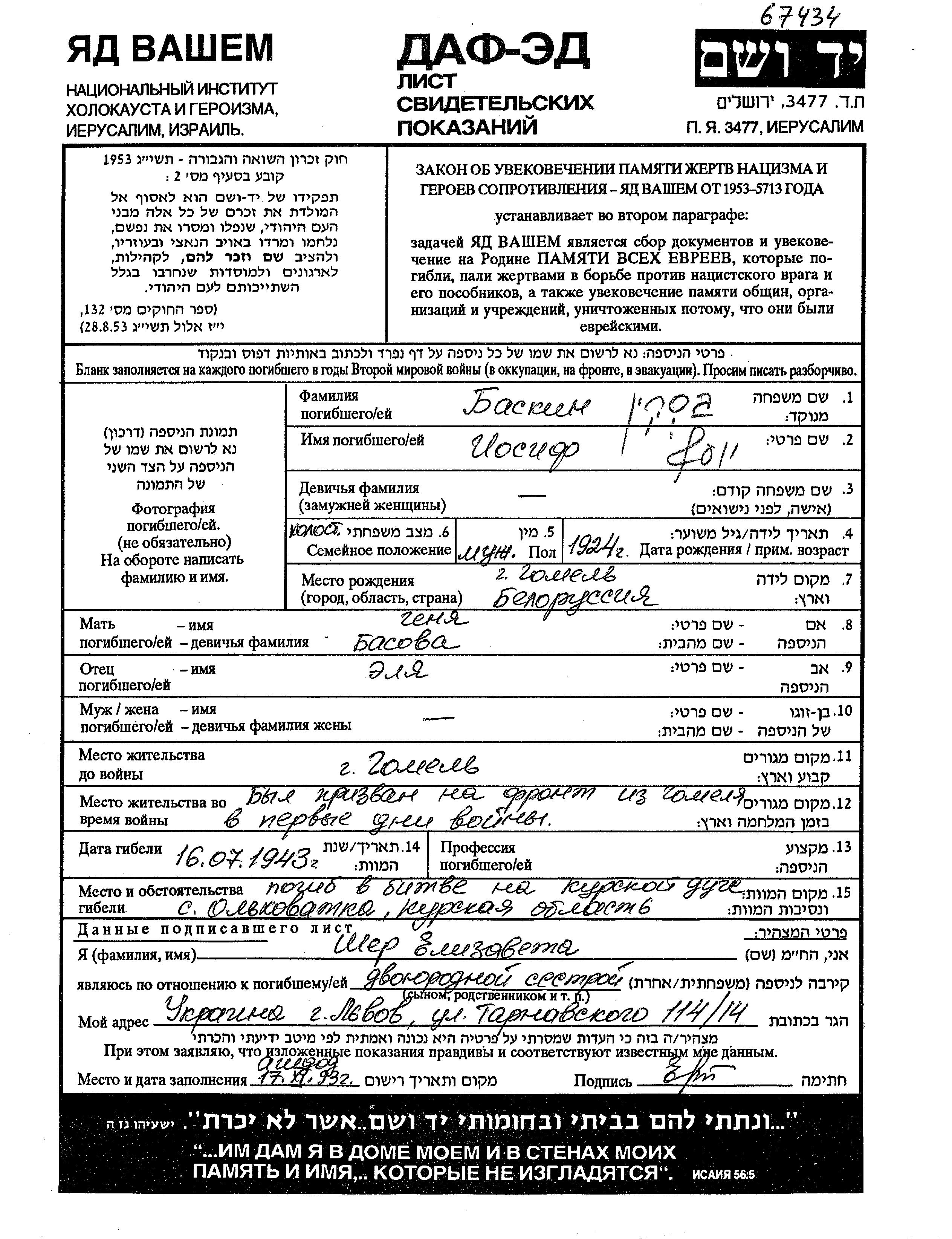 Баскин Иосиф 1924 Гомель, Белоруссия (СССР) Лист свидетельских показаний