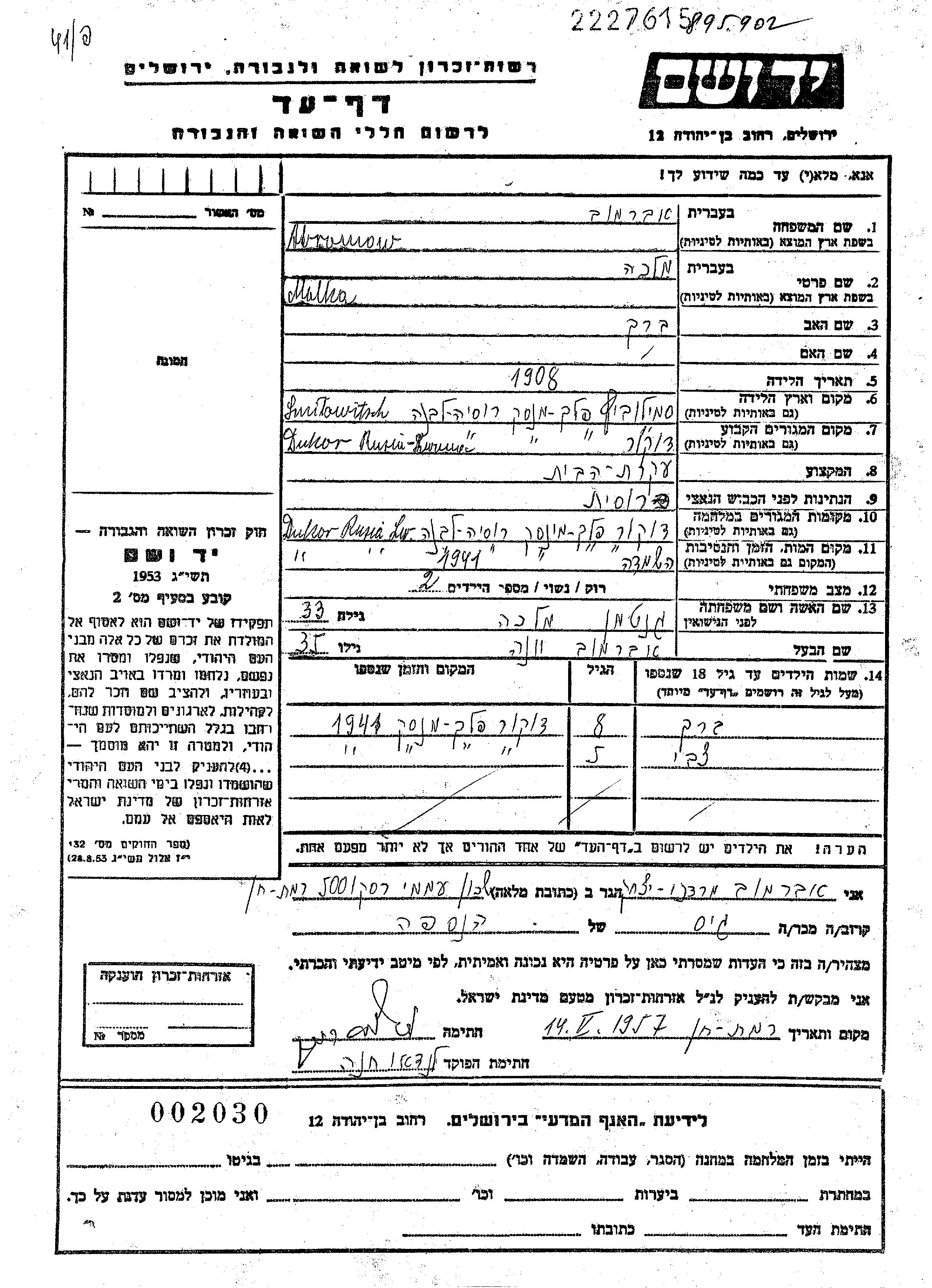 Яд Вашем - Листы свидетельских показаний Мемориального фонда