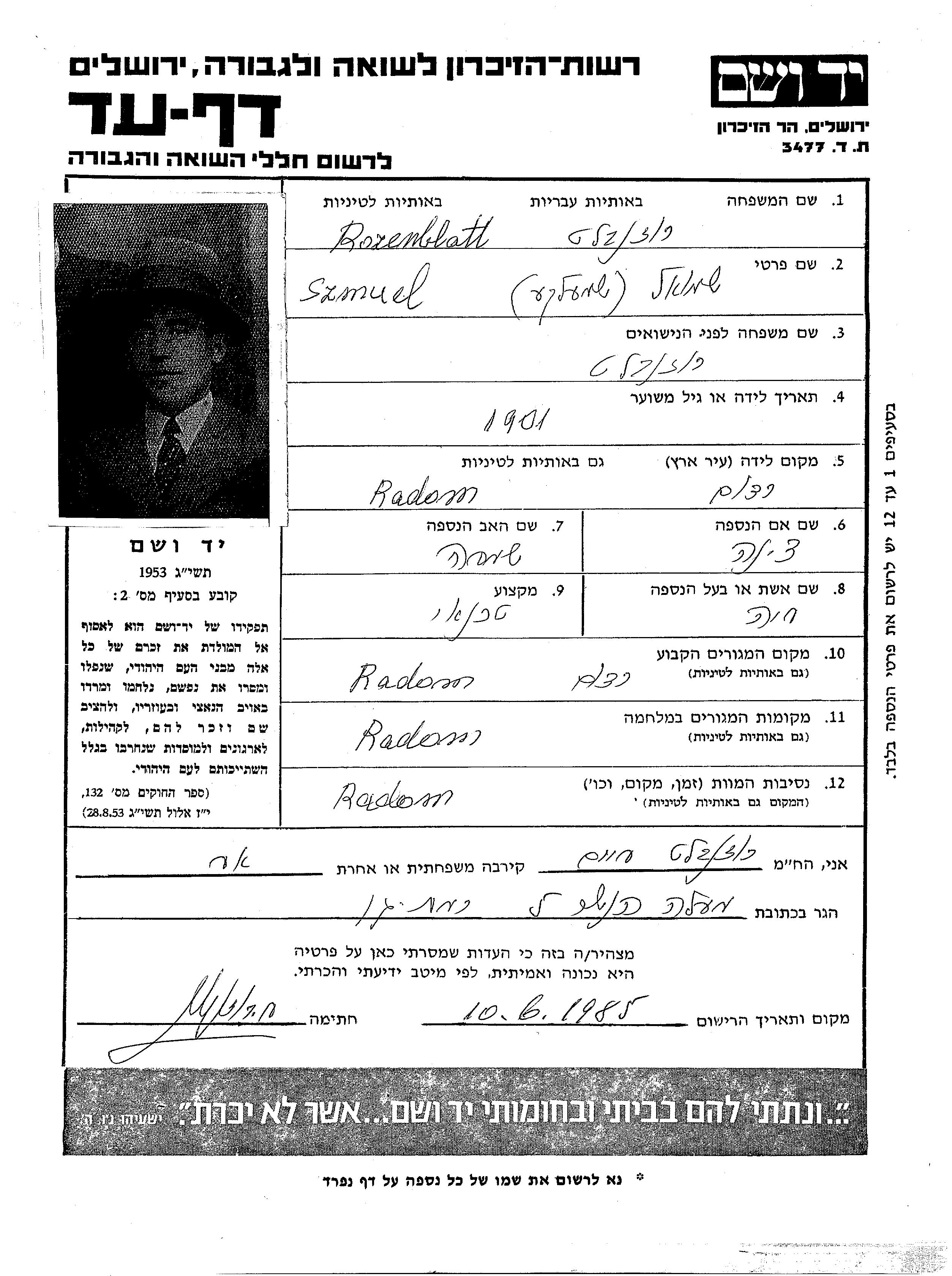 Розенблатт Шмуэль 1901 Радом, Польша Лист свидетельских показаний