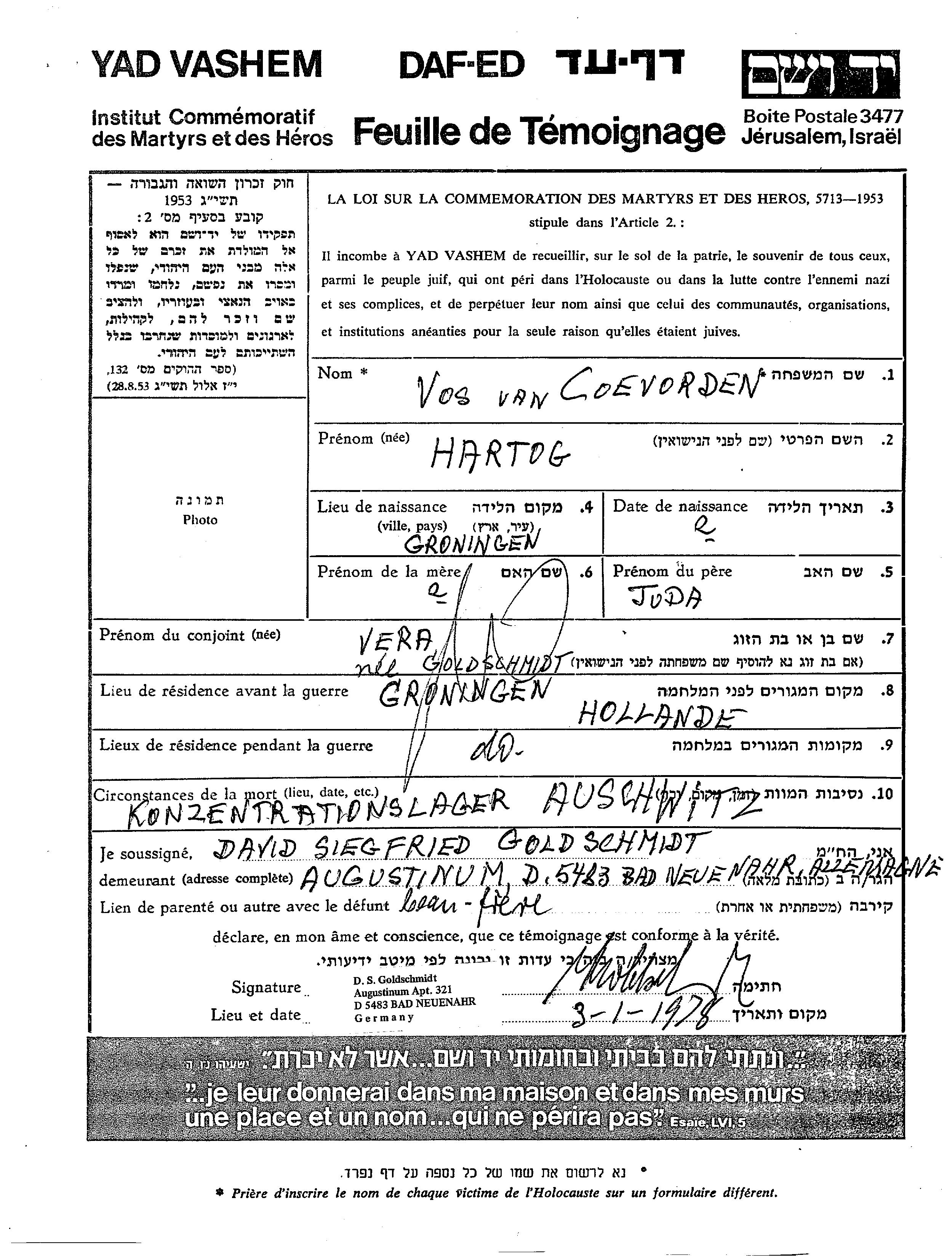Хертог Фос ван Куворден, место рождения: Гронинген, Нидерланды. Место жительства до войны: Гронинген, Нидерланды.