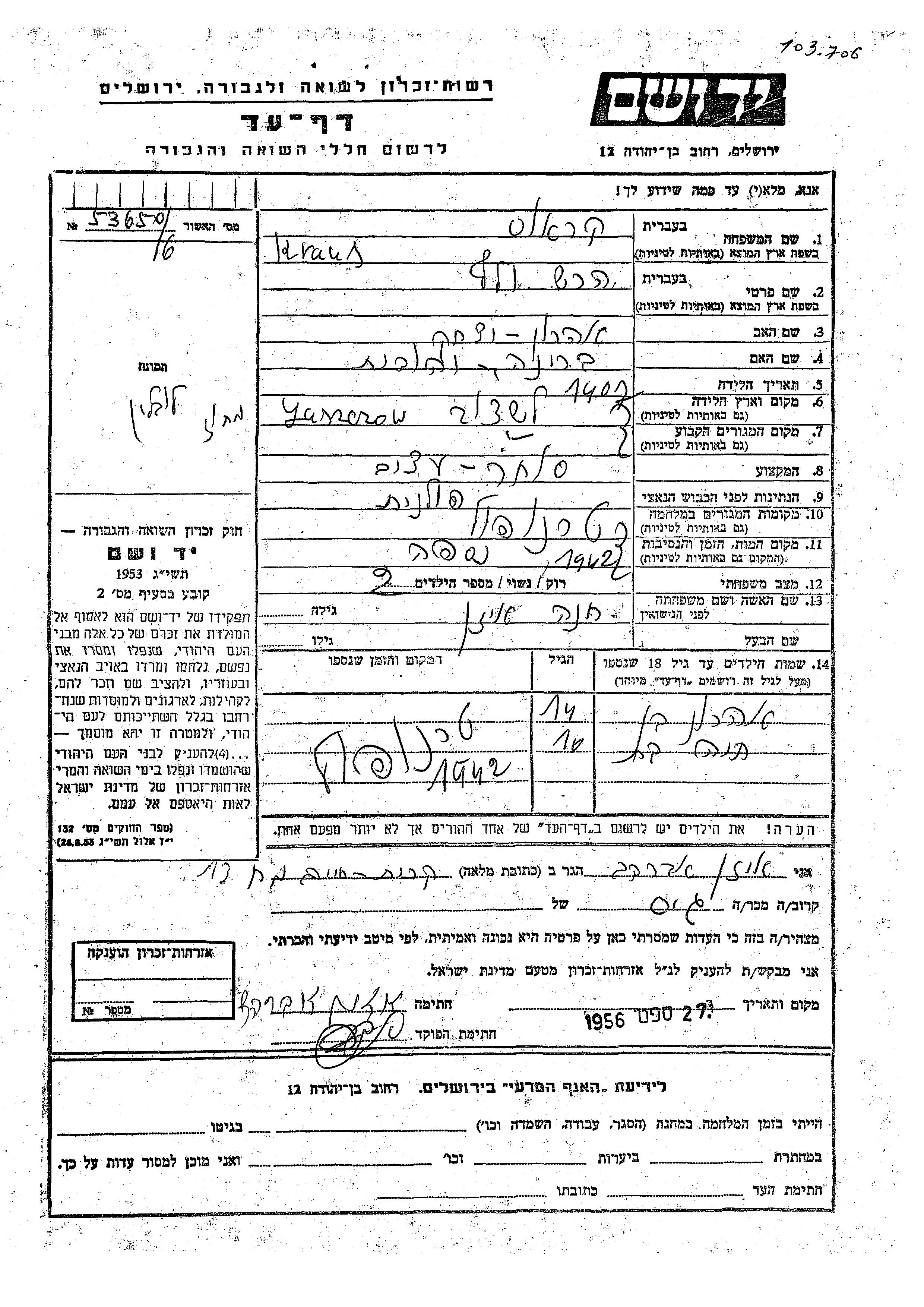 Яд Вашем - Листы свидетельских показаний Мемориального фонда