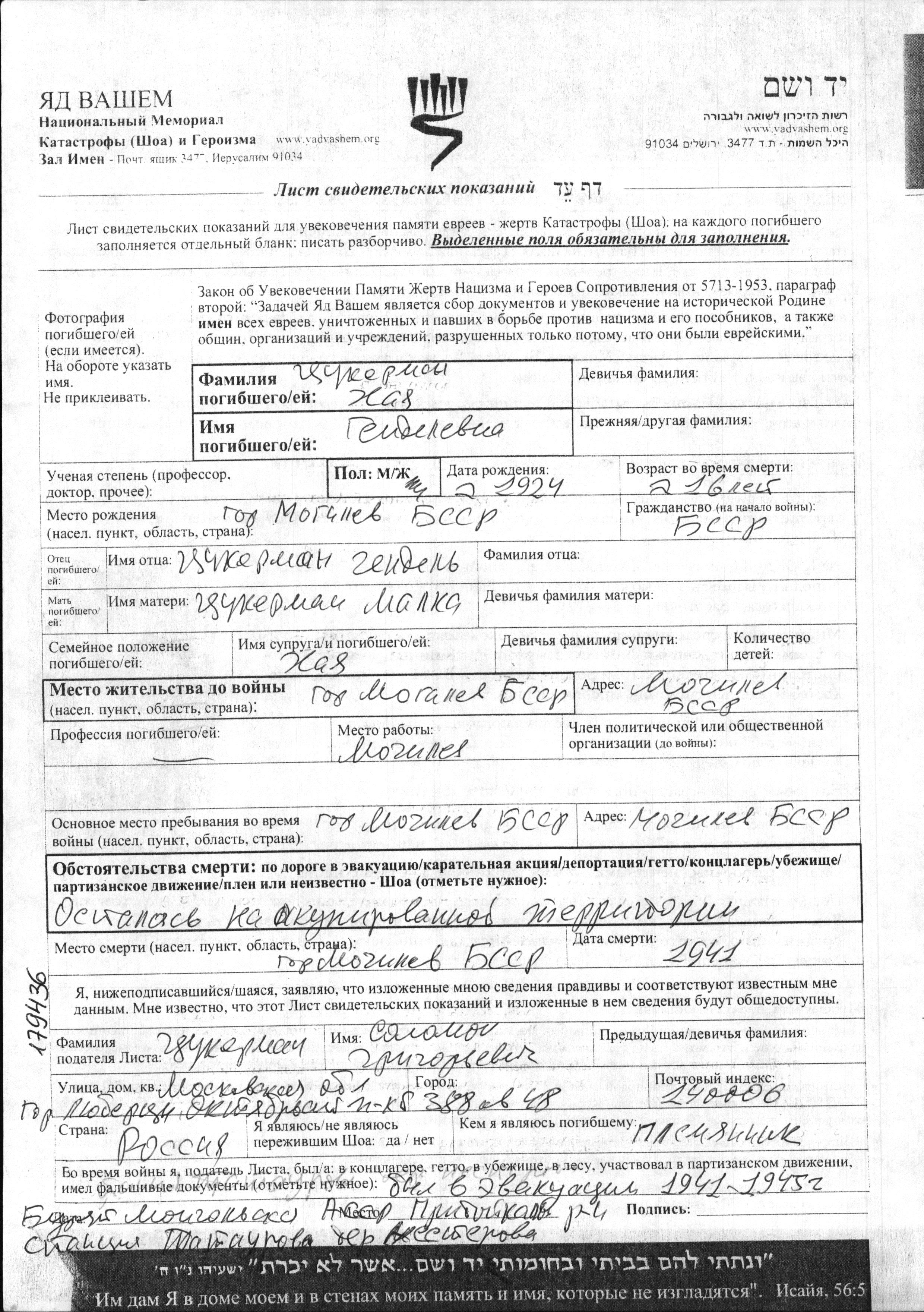 | Цукерман | Хая | 1924 | Могилёв, Белоруссия (СССР) | Лист свидетельских показаний |