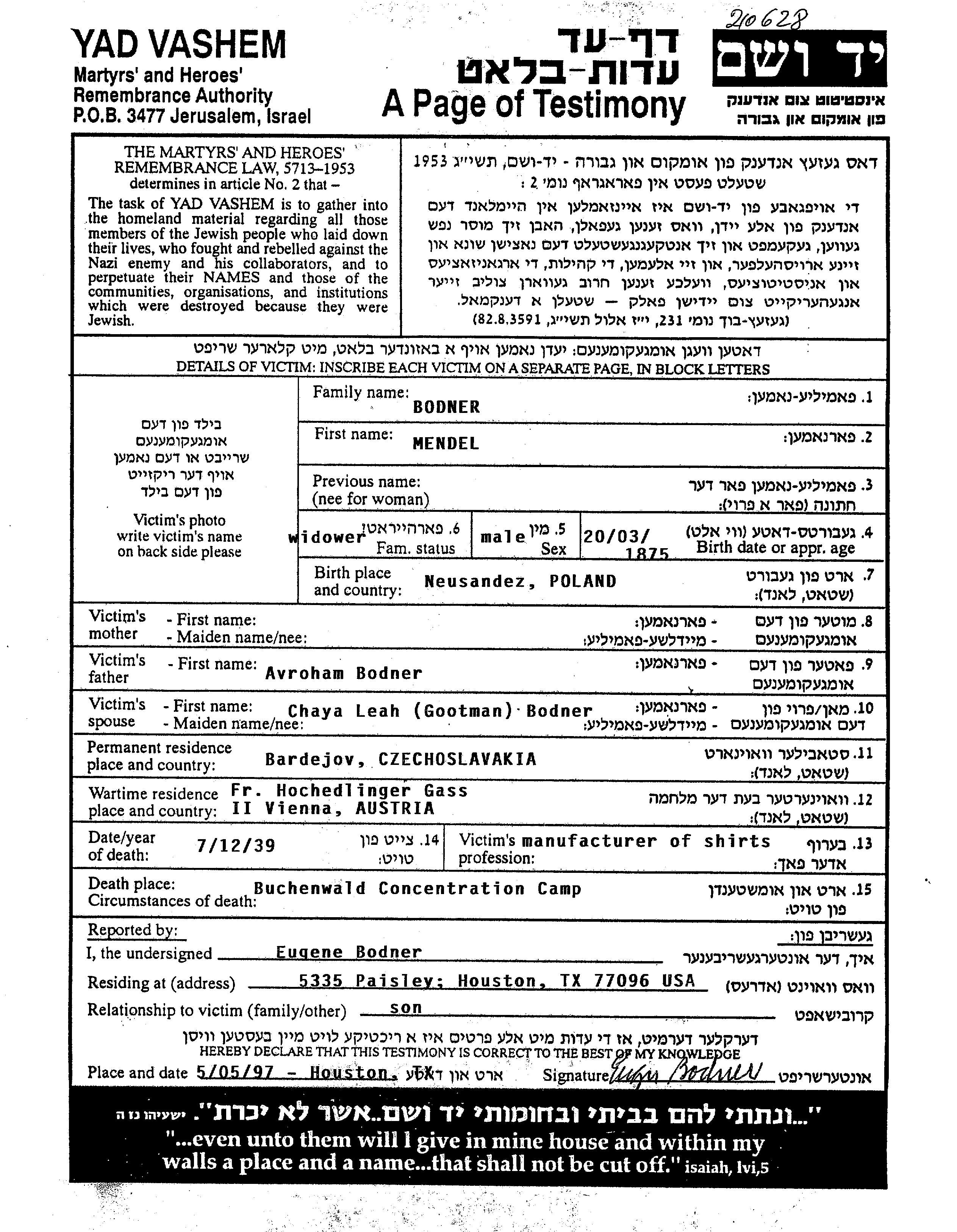 Боднер | Мендель | 1875 | Бардеёв, Чехословакия | Лист свидетельских показаний |