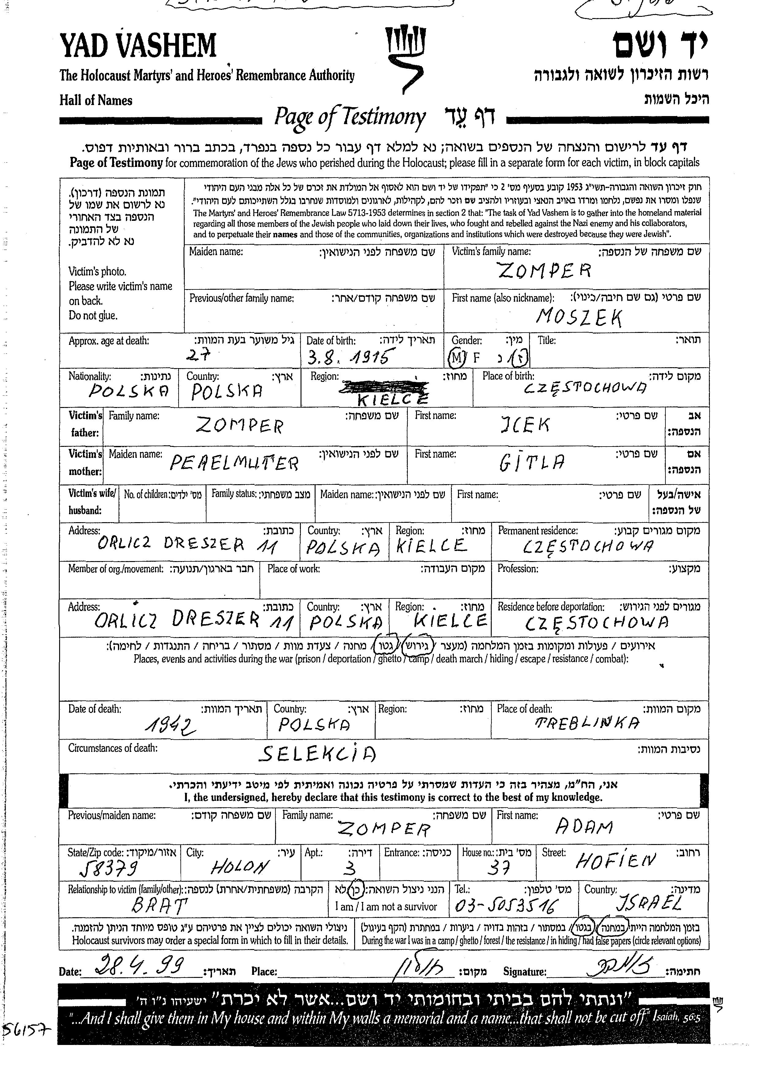 Моше Зомпер, место рождения: Ченстохов, Польша. Место жительства до войны: Ченстохова, Польша.