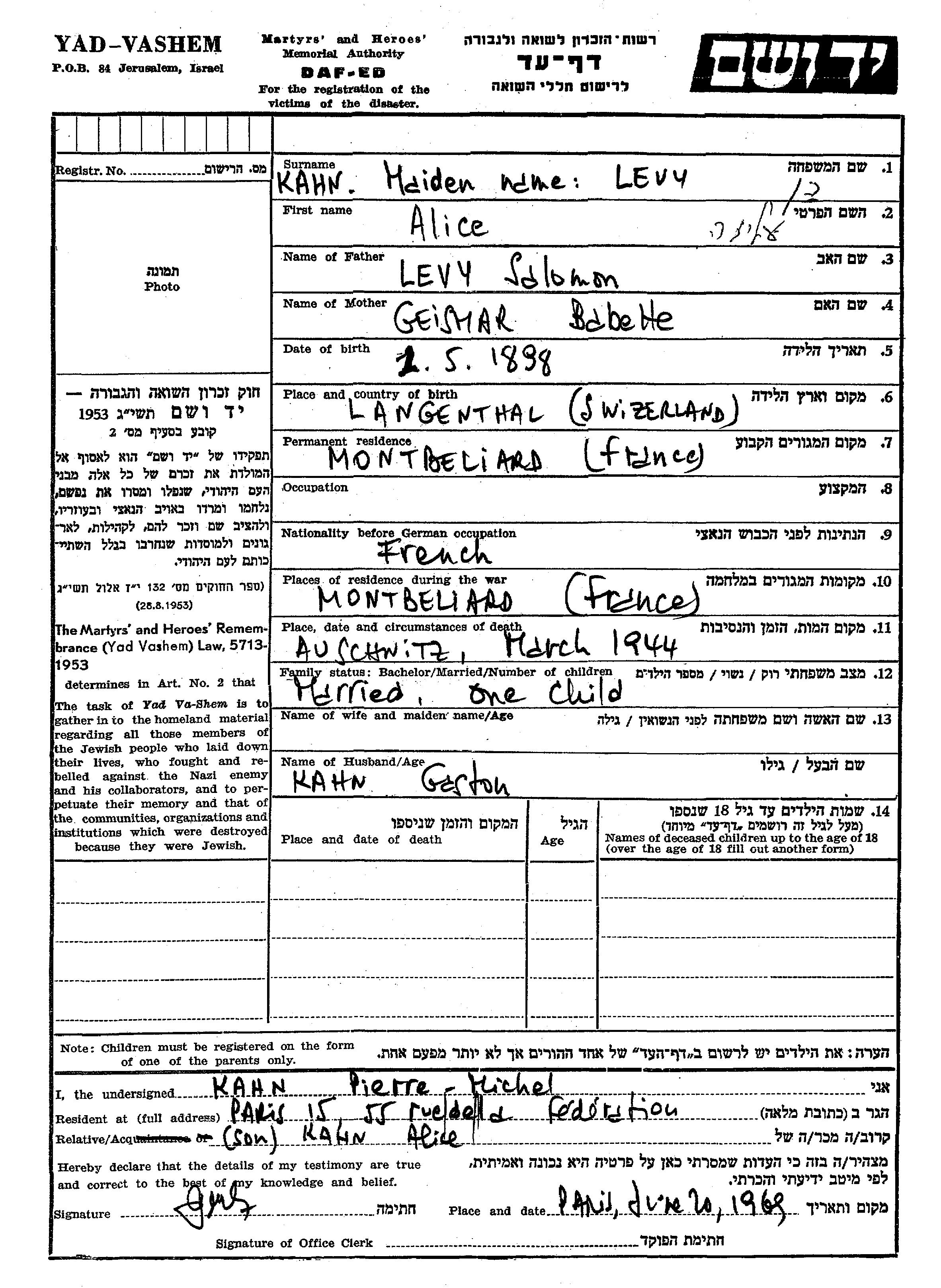 Алис Кан, девичья фамилия Леви, место рождения: Лангенталь, Швейцария. Отец: Саломон, mать:Бабетт, девичья фамилия Гейсмар. Женат / замужем. Место жительства до войны: Монбельяр, Франция. Место во время войны: Монбельяр, Франция.